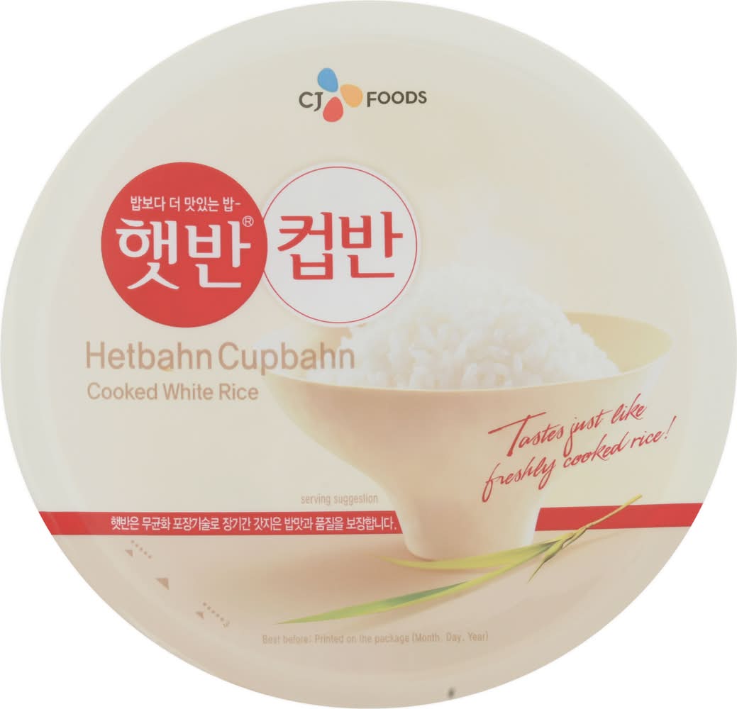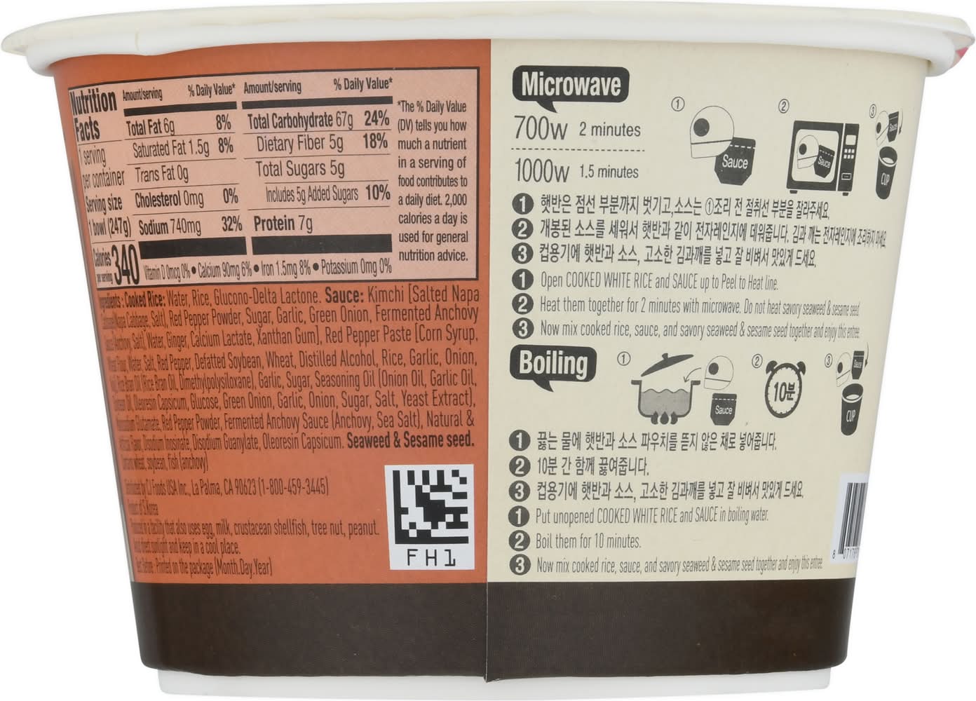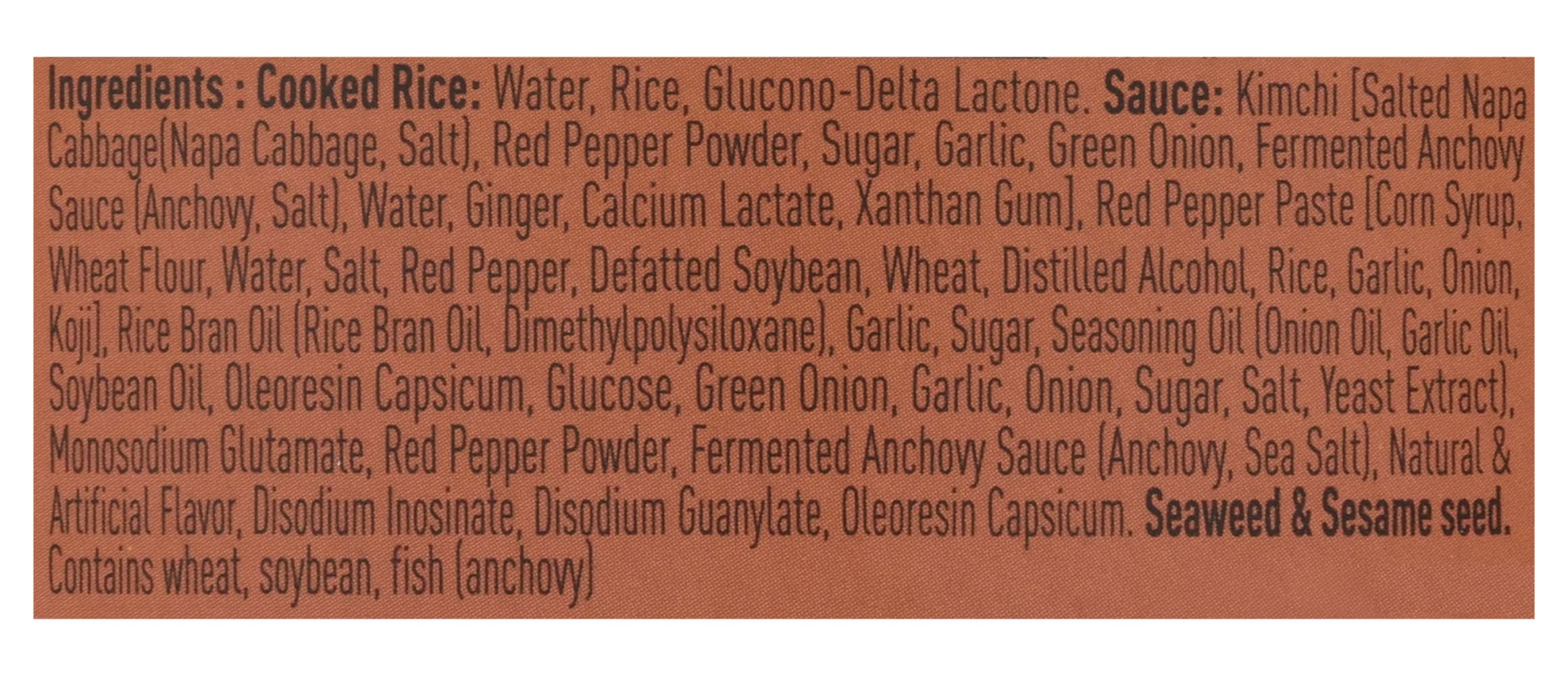 Ingredients: Cooked Rice: Water, Rice, Glucono-Delta Lactone, Sauce: Kimchi (Salted Napa Cabbage (Napa Cabbage, Salt), Red Pepper Powder, Sugar, Garlic, Green Onion, Fermented Anchovy Sauce (Anchovy, Salt), Water, Ginger, Calcium Lactate, Xanthan Gum), Red Pepper Paste (Corn Syrup, Wheat Flour, Water, Salt, Red Pepper, Defatted Soybean, Wheat, Distilled Alcohol, Rice, Garlic, Onion, Koji), Rice Bran Oil (Rice Bran Oil, Dimethylpolysiloxane), Garlic, Sugar, Seasoning Oil (Onion Oil, Garlic Oil Soybean Oil, Oleoresin Capsicum, Glucose, Green Onion, Garlic, Onion, Sugar, Salt, Yeast Extract), Monosodium Glutamate, Red Pepper Powder, Fermented Anchovy Sauce (Anchovy, Sea Sat), Natural & Artificial Flavor, Disodium Inosinate, Disodium Guanylate, Oleoresin Capsicum, Seaweed & Sesame Seed Contains: Wheat, Soybeans, Fish, Anchovy, Sesame, Corn, Fish, Eggs, Milk, Crustacean Shellfish, Tree Nuts, Peanuts