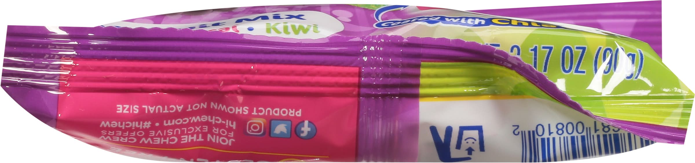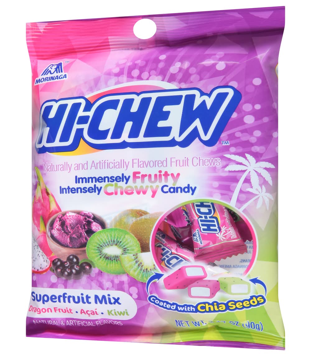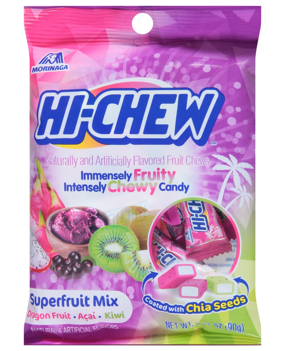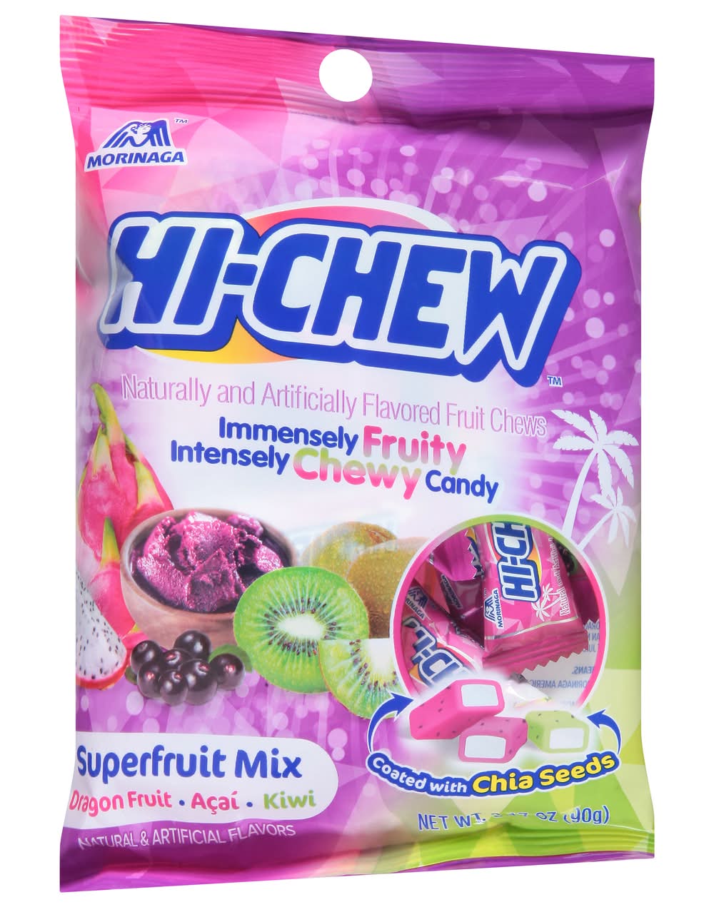 Immensely fruity. Intensely chewy candy. Naturally & artificially flavored fruit chews. Natural & artificial flavors. 0 g trans fat per serving. Gluten-free. How It All Began: Hi-Chew was developed in Japan in 1975 with the goal of providing a candy that offered long-lasting real fruit flavors and a one-of-a-kind unique chewy texture. Since then, has become an international sensation and has been produced in over 170 flavors around the world! With products available in a variety of stick and bag formats, there's a Hi-Chew option for everyone to love. Chew on This: No synthetic colors. Made with concentrated fruit juices. Flavor ratio may vary. • Flavor: Dragon fruit-acai-kiwi • Morinaga America, Inc., Irivine, Ca, 92614.