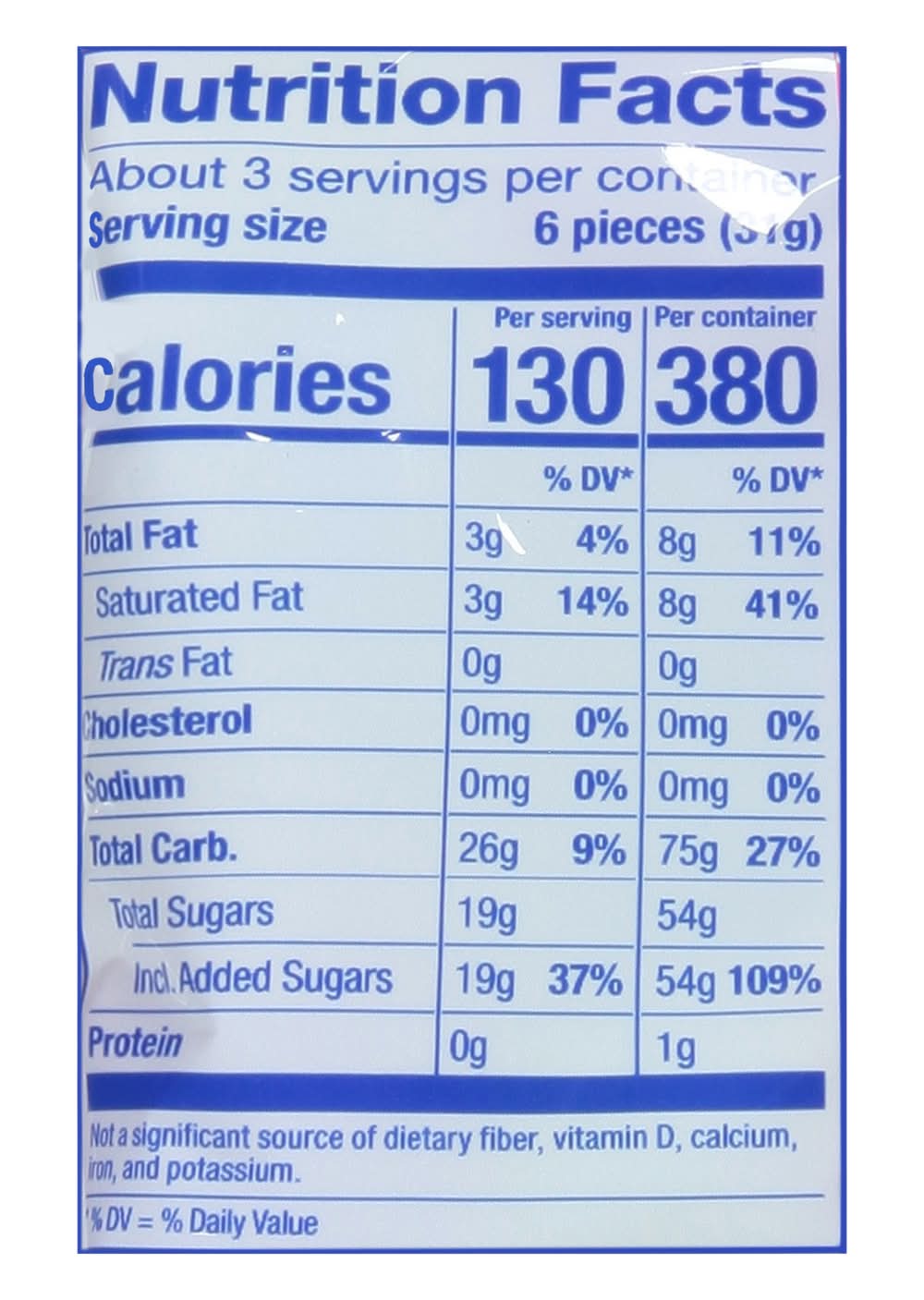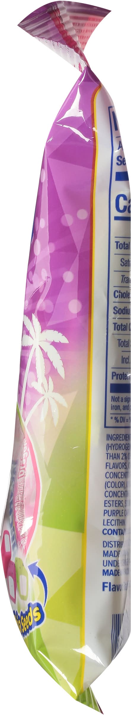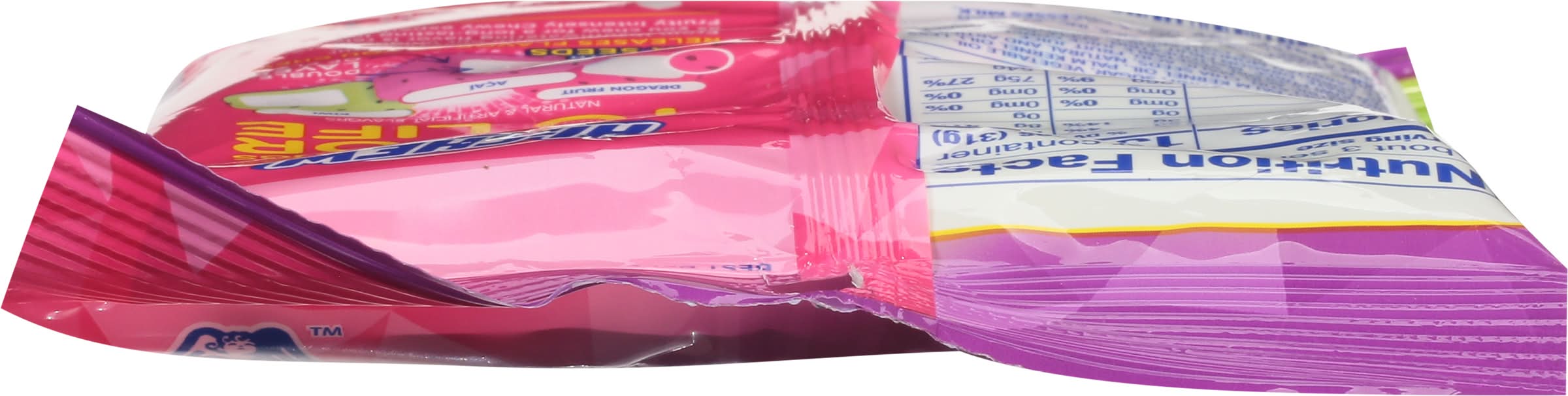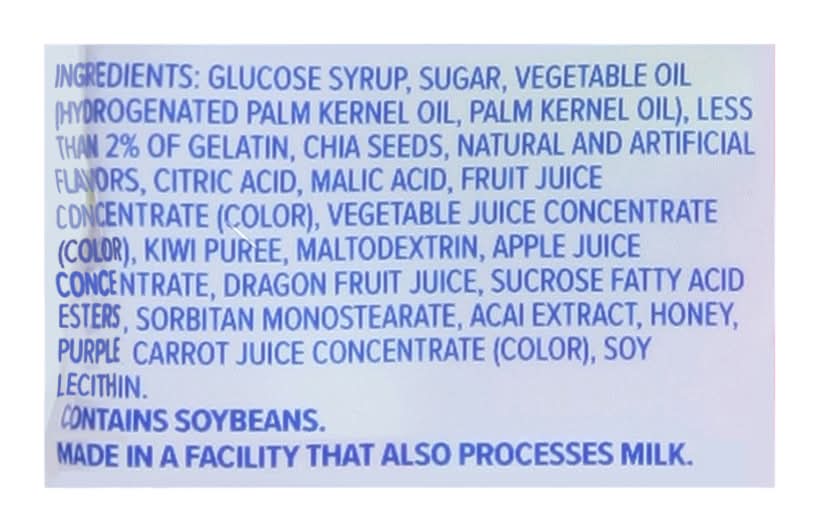Ingredients: Glucose Syrup, Sugar, Vegetable Oil (Hydrogenated Palm Kernel Oil Palm Kernel Oil), Less than 2% of Gelatin, Chia Seeds, Natural and Artificial Flavors, Citric Acid, Malic Acid, Fruit Juice Concentrate (Color), Vegetable Juice Concentrate (Color), Kiwi Puree, Maltodextrin, Apple Juice Concentrate, Dragon Fruit Juice, Sucrose Fatty Acid Esters, Sorbitan Monostearate, Acai Extract, Honey, Purple Carrot Juice Concentrate (Color), Soy Lecithin Contains: Soybeans, Milk