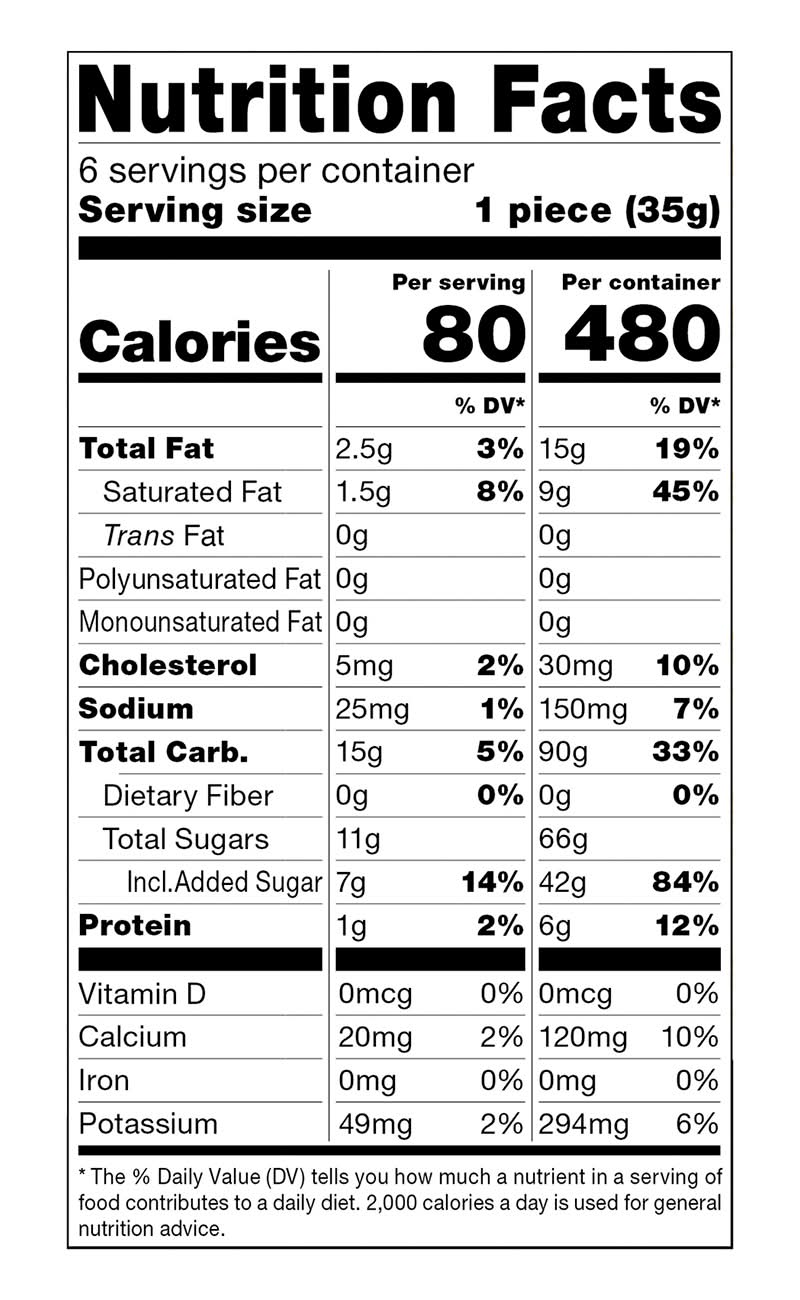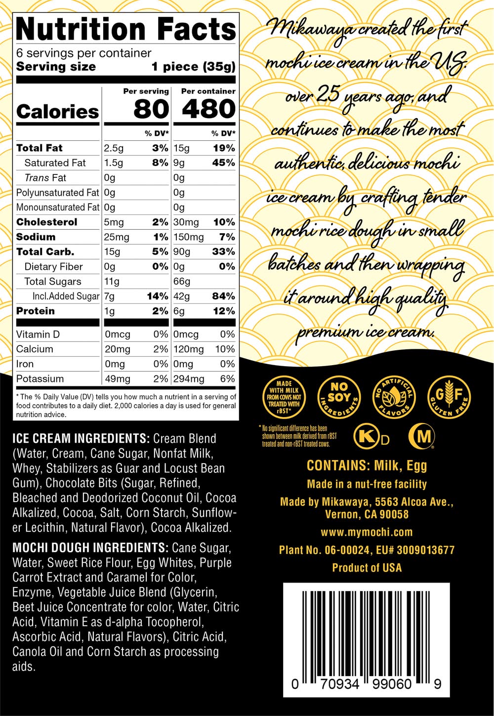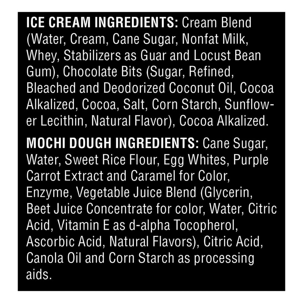Ingredients: Ice Cream Ingredients: Cream Blend (Water, Cream, Cane Sugar, Nonfat Milk, Whey, Stabilizers as Guar and Locust Bean Gum), Chocolate Bits (Sugar, Refined, Bleached and Deodorized Coconut Oil, Cocoa Alkalized, Cocoa, Salt, Corn Starch, Sunflower Lecithin, Natural Flavor), Cocoa Alkalized. Mochi Dough Ingredients: Cane Sugar, Water, Sweet Rice Flour, Egg Whites, Purple Carrot Extract and Caramel for Color, Enzyme, Vegetable Juice Blend (Glycerin, Beet Juice Concentrate for Color, Water, Citric Acid, Vitamin E as D-Alpha Tocopherol, Ascorbic Acid, Natural Flavors), Citric Acid, Canola Oil and Corn Starch as Processing Aids Contains: Milk, Eggs, Peanuts, Tree Nuts, Wheat