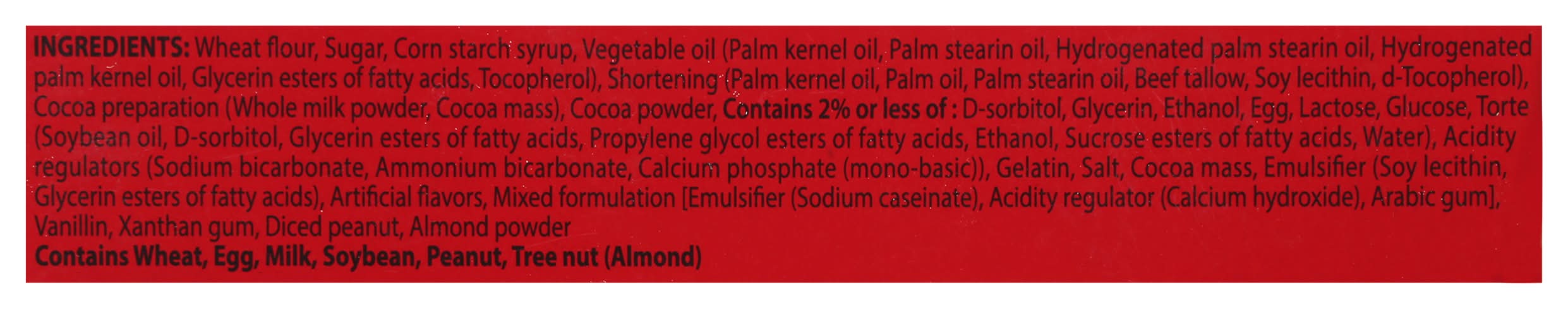 Ingredients: Wheat Flour, Sugar, Corn Starch Syrup, Vegetable Oil (Palm Kernel Oil, Palm Stearin Oil, Hydrogenated Palm Stearin Oil, Hydrogenated Palm Kernel Oil, Glycerin Esters of Fatty Acids, Tocopherol), Shortening (Palm Kernel Oil, Palm Oil, Palm Stearin Oil, Beef Tallow, Soy Lecithin, D-Tocopherol), Cocoa Preparation (Whole Milk Powder, Cocoa Mass), Cocoa Powder, Contains 2% or Less of: D-Sorbitol, Glycerin, Ethanol, Egg, Lactose, Glucose, Torte (Soybean Oil, D-Sorbitol, Glycerin Esters of Fatty Acids, Propylene Glycol Esters of Fatty Acids, Ethanol, Sucrose Esters of Fatty Acids, Water), Acidity Regulators (Sodium Bicarbonate, Ammonium Bicarbonate, Calcium Phosphate (Mono-Basic), Gelatin, Salt, Cocoa Mass, Emulsifier (Soy Lecithin, Glycerin Esters of Fatty Acids), Artificial Flavors, Mixed Formulation [Emulsifier [Sodium Caseinate)), Acidity Regulator (Calcium Hydroxide), Arabic Gum], Vanillin, Xanthan Gum, Diced Peanut, Almond Powder Contains: Wheat, Eggs, Milk, Soybeans, Peanuts, Tree Nuts