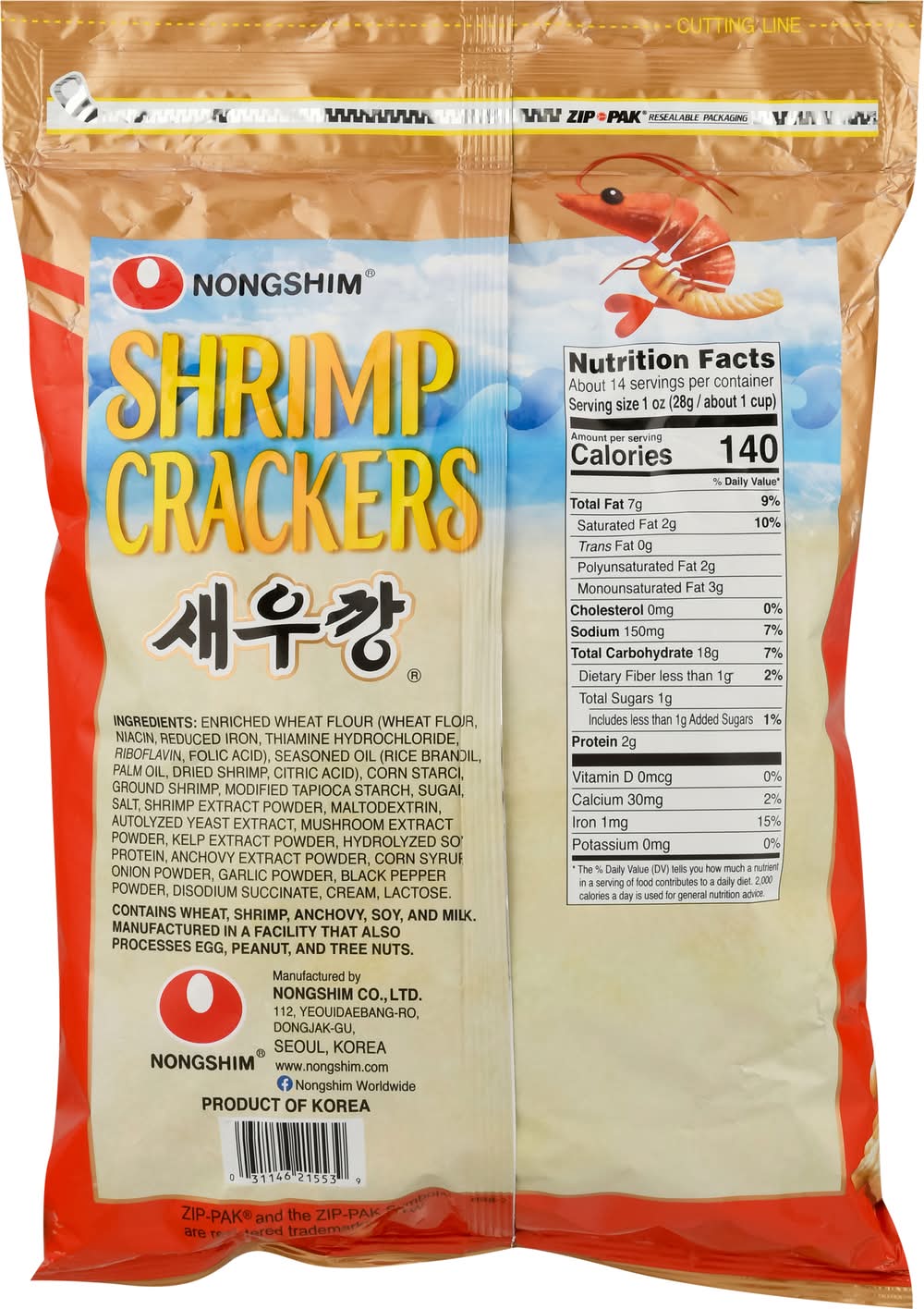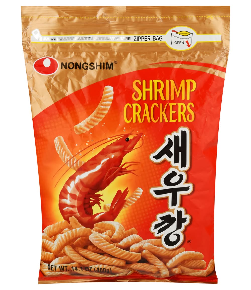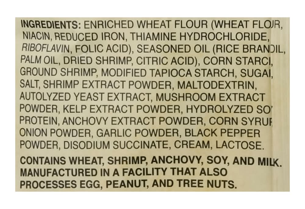 Ingredients: Enriched Wheat Flour (Wheat Flour, Niacin, Reduced Iron, Thiamine Hydrochloride, Riboflavin, Folic Acid), Seasoned Oil (Rice Brand oil, Palm Oil, Dried Shrimp, Citric Acid), Corn Starch, Ground Shrimp, Modified Tapioca Starch, Sugar, Salt, Shrimp Extract Powder, Maltodextrin, Autolyzed Yeast Extract, Mushroom Extract Powder, Kelp Extract Powder, Hydrolyzed Soy Protein, Anchovy Extract Powder, Corn Syrup Onion Powder, Garlic Powder, Black Pepper Powder, Disodium Succinate, Cream, Lactose Contains: Wheat, Crustacean Shellfish, Shrimp, Fish, Anchovy, Soybeans, Milk, Corn, Lactose, Eggs, Peanuts, Tree Nuts