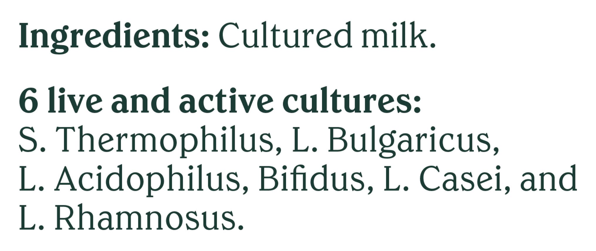 Ingredients: Cultured Milk. 6 Live and Active Cultures: S. Thermophilus, L. Bulgaricus, L. Acidophilus, Bifidus, L. Casei, and L. Rhamnosus. Contains: Milk