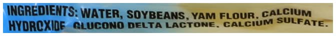 Ingredients: Water, Soybeans, Yam Flour, Calcium Hydroxide, Glucono Delta Lactone, Calcium Sulfate Contains: Soybeans