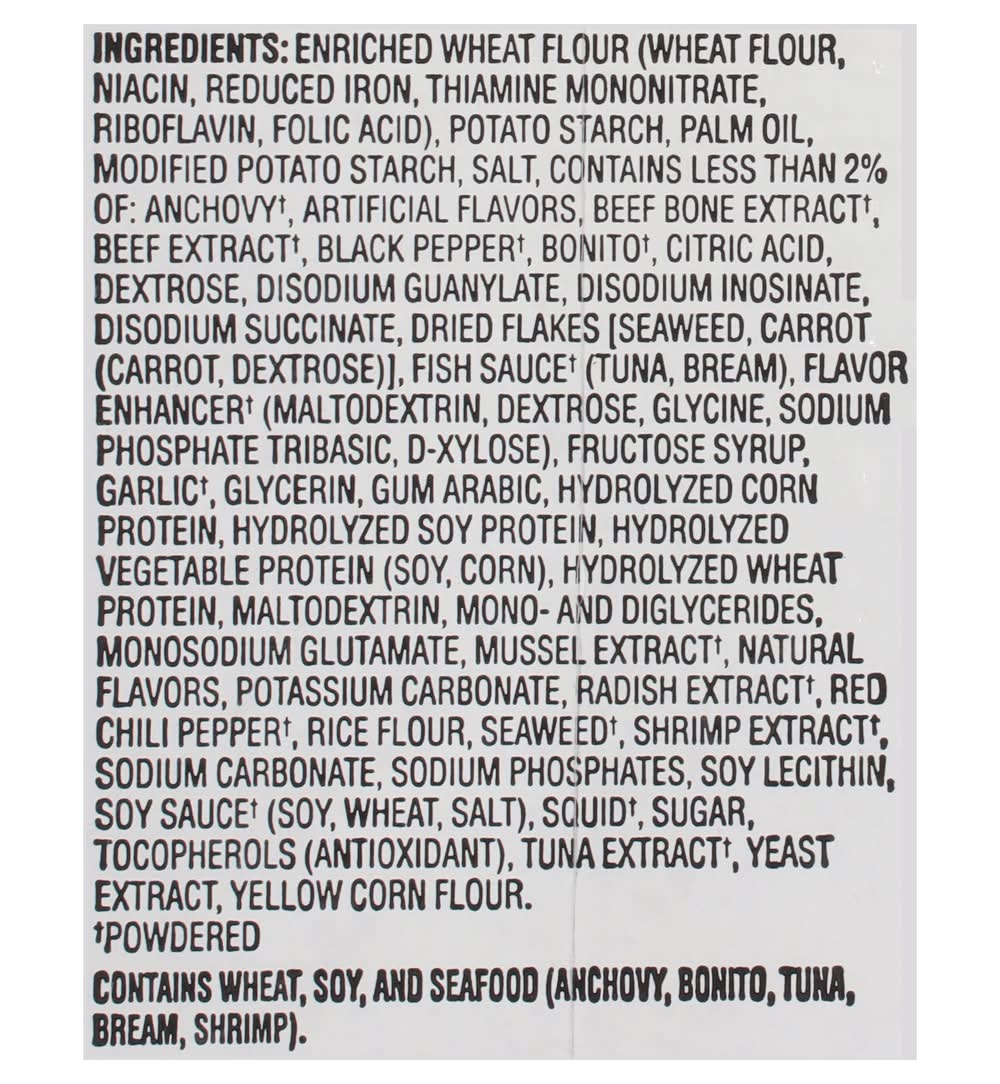 Ingredients: Enriched Wheat Flour (Wheat Flour, Niacin, Reduced Iron, Thiamine Mononitrate, Riboflavin, Folic Acid), Potato Starch, Palm Oil, Modified Potato Starch, Salt, Contains Less than 2% of: Anchovy(a), Artificial Flavors, Beef Bone Extract(a), Beef Extract(a), Black Pepper(a), Bonito(a), Citric Acid, Dextrose, Disodium Guanylate, Disodium Inosinate, Disodium Succinate, Dried Flakes [Seaweed, Carrot (Carrot, Dextrose)], Fish Sauce(a) (Tuna, Bream), Flavor Enhancer(a) (Maltodextrin, Dextrose, Glycine, Sodium Phosphate Tribasic, D-Xylose), Fructose Syrup, Garlic(a), Glycerin, Gum Arabic, Hydrolyzed Corn Protein, Hydrolyzed Soy Protein, Hydrolyzed Vegetable Protein (Soy, Corn), Hydrolyzed Wheat Protein, Maltodextrin, Mono- and Diglycerides, Monosodium Glutamate, Mussel Extract(a), Natural Flavors, Potassium Carbonate, Radish Extract(a), Red Chili Pepper(a), Rice Flour, Seaweed(a), Shrimp Extract(a), Sodium Carbonate, Sodium Phosphates, Soy Lecithin, Soy Sauce(a) (Soy, Wheat, Salt), Squid(a), Sugar, Tocopherols (Antioxidant), Tuna Extract(a), Yeast Extract, Yellow Corn Flour. (a) Powdered Contains: Wheat, Soybeans, Fish, Anchovy, Fish, Tuna, Fish, Bream, Crustacean Shellfish, Shrimp, Milk, Eggs, Tree Nuts, Peanuts, Fish, Crustacean Shellfish, Sesame