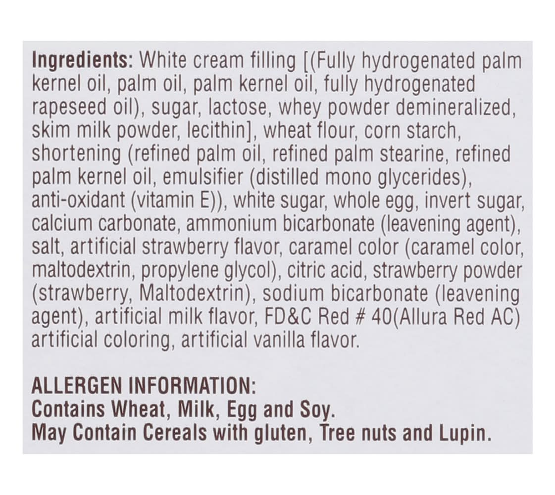 Ingredients: White Cream Filling [(Fully Hydrogenated Palm Kernel Oil, Palm Oil, Palm Kernel Oil, Fully Hydrogenated Rapeseed Oil), Sugar, Lactose, Whey Powder Demineralized, Skim Milk Powder, Lecithin], Wheat Flour, Corn Starch, Shortening (Refined Palm Oil, Refined Palm Stearine, Refined Palm Kernel Oil, Emulsifier (Distilled Mono Glycerides), Anti-Oxidant (Vitamin E)), White Sugar, Whole Egg, Invert Sugar, Calcium Carbonate, Ammonium Bicarbonate (Leavening Agent), Salt, Artificial Strawberry Flavor, Caramel Color (Caramel Color, Maltodextrin, Propylene Glycol), Citric Acid, Strawberry Powder (Strawberry, Maltodextrin), Sodium Bicarbonate (Leavening Agent), Artificial Milk Flavor, FD&C Red 40(Allura Red Ac) Artificial Coloring, Artificial Vanilla Flavor Contains: Wheat, Milk, Eggs, Soybeans, Lactose, Corn, Gluten, Tree Nuts, Lupine