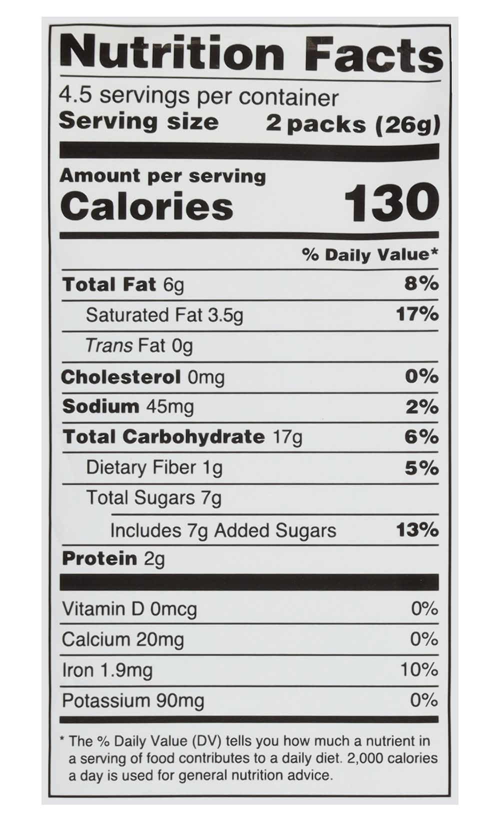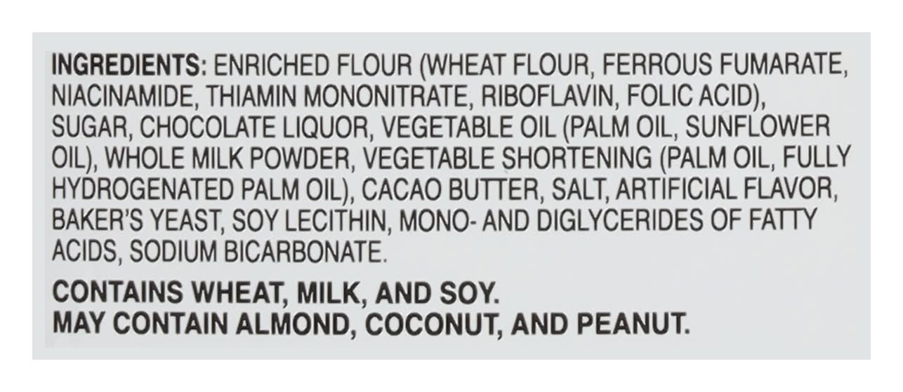 Ingredients: Enriched Flour (Wheat Flour, Ferrous Fumarate, Niacinamide, Thiamin Mononitrate, Riboflavin, Folic Acid), Sugar, Chocolate Liquor, Vegetable Oil (Palm Oil, Sunflower Oil), Whole Milk Powder, Vegetable Shortening (Palm Oil, Fully Hydrogenated Palm Oil), Cacao Butter, Salt, Artificial Flavor, Baker's Yeast, Soy Lecithin, Mono- and Diglycerides of Fatty Acids, Sodium Bicarbonate Contains: Wheat, Milk, Soybeans, Tree Nuts, Almonds, Tree Nuts, Coconuts, Peanuts
