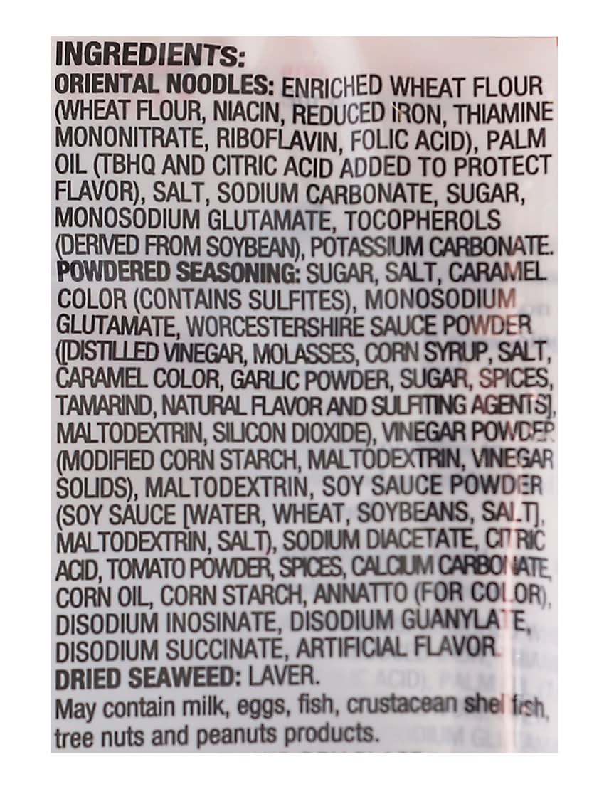 Ingredients: Oriental Noodles: Enriched Wheat Flour (Wheat Flour, Niacin, Reduced Iron, Thiamine Mononitrate, Riboflavin, Folic Acid), Palm Oil (TBHQ and Citric Acid Added to Protect Flavor), Salt, Sodium Carbonate, Sugar, Monosodium Glutamate, Tocopherols (Derived from Soybean), Potassium Carbonate, Powdered Seasoning: Sugar, Salt, Caramel Color (Contains Sulfites), Monosodium Glutamate, Worcestershire Sauce Powder [(Distilled Vinegar, Molasses, Corn Syrup, Salt, Caramel Color, Garlic Powder, Sugar, Spices, Tamarind, Natural Flavor and Sulfiting Agents), Maltodextrin, Silicon Dioxide], Vinegar Powder (Modified Corn Starch, Maltodextrin, Vinegar Solids), Maltodextrin, Soy Sauce Powder [Soy Sauce (Water, Wheat, Soybeans, Salt), Maltodextrin, Salt], Sodium Diacetate, Citric Acid, Tomato Powder, Spices, Calcium Carbonate, Corn Oil, Corn Starch, Annatto (for Color), Disodium Inosinate, Disodium Guanylate, Disodium Succinate, Artificial Flavor, Dried Seaweed: Laver Contains: Wheat, Soybeans, Milk, Eggs, Fish, Crustacean Shellfish, Tree Nuts, Peanuts