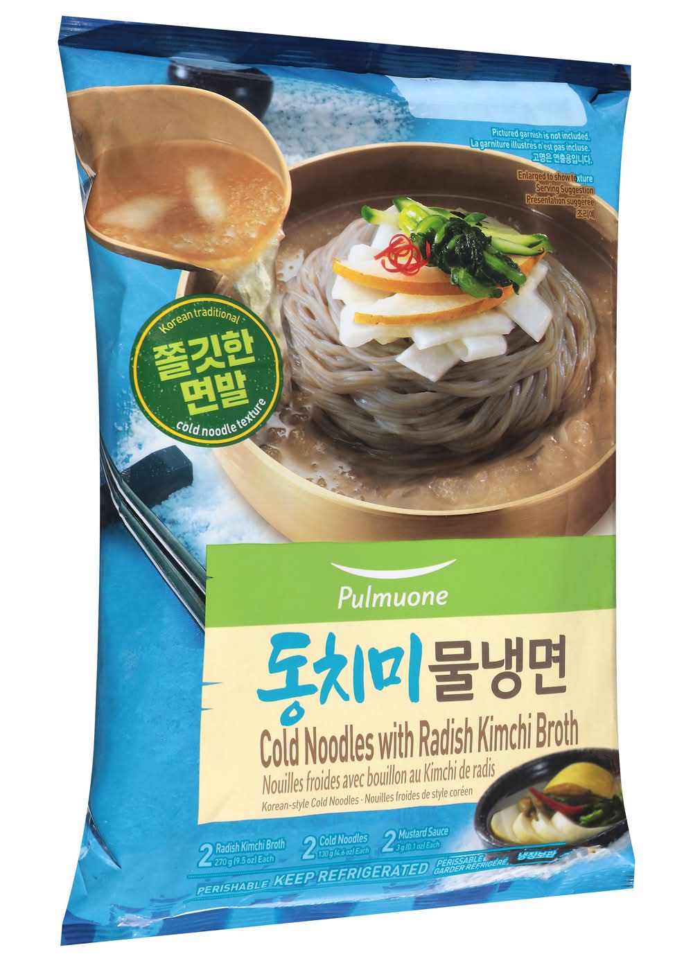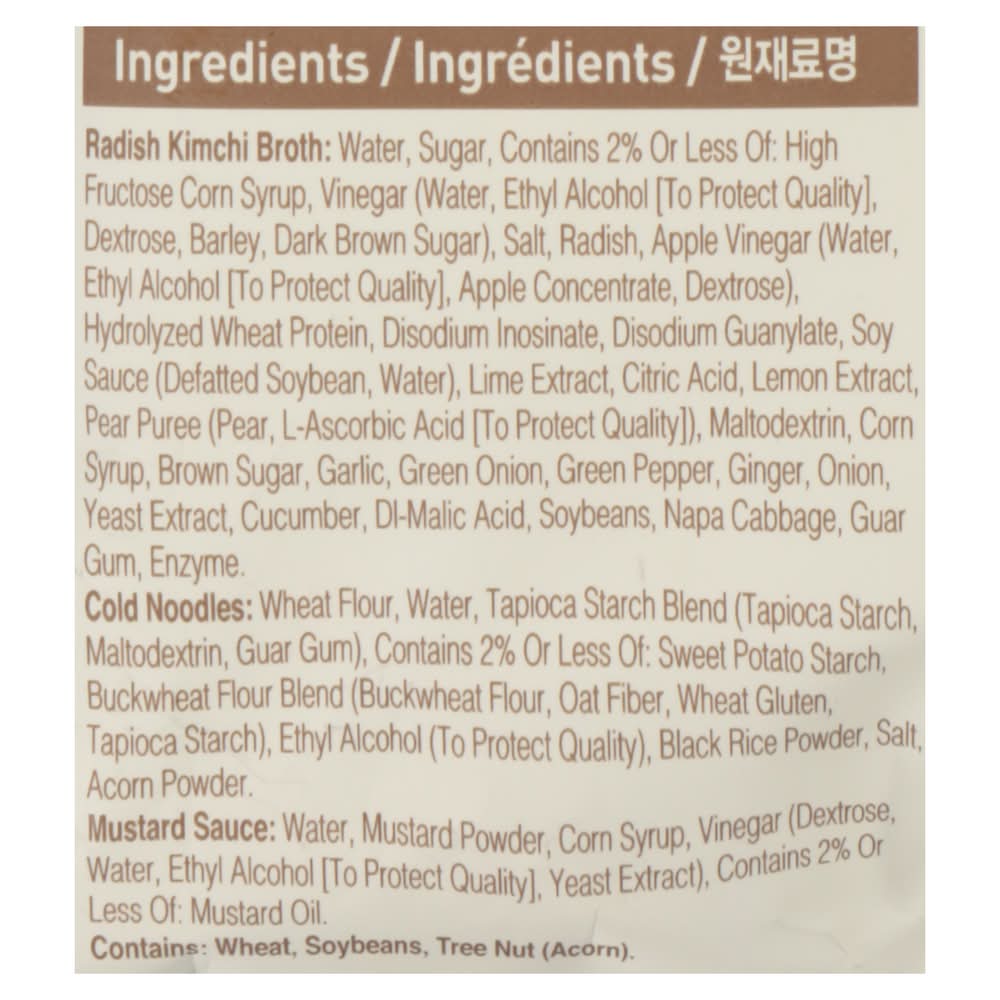 Ingredients: Radish Kimchi Broth: Water, Sugar, Contains 2% or Less of: High Fructose Corn Syrup, Vinegar (Water, Ethyl Alcohol [to Protect Quality], Dextrose, Barley, Dark Brown Sugar), Salt, Radish, Apple Vinegar (Water, Ethyl Alcohol [to Protect Quality], Apple Concentrate, Dextrose), Hydrolyzed Wheat Protein, Disodium Inosinate, Disodium Guanylate, Soy Sauce (Defatted Soybean, Water), Lime Extract, Citric Acid, Lemon Extract, Pear Puree (Pear, L-Ascorbic Acid [to Prote Quality]), Maltodextrin, Corn Syrup, Brown Sugar, Garlic, Green Onion, Green Pepper, Ginger, Onion, Yeast Extract, Cucumber, Di-Malic Acid, Soybeans, Napa Cabbage, Guar Gum, Enzyme, Cold Noodles: Wheat Flour, Water, Tapioca Starch Blend (Tapioca Starch, Maltodextrin, Guar Gum), Contains 2% or Less of: Sweet Potato Starch, Buckwheat Flour Blend (Buckwheat Flour, Oat Fiber, Wheat Gluten, Tapioca Starch), Ethyl Alcohol (to Protect Quality), Black Rice Powder, Salt, Acorn Powder, Mustard Sauce: Water, Mustard Powder, Corn Syrup, Vinegar (Dextrose, Water, Ethyl Alcohol [to Protect Quality), Yeast Extract), Contains 2% or Less of: Mustard Oil Contains: Barley, Wheat, Soybeans, Oat, Gluten, Mustard, Tree Nuts