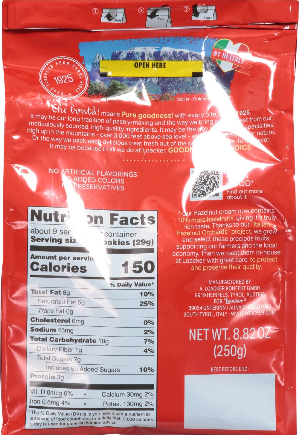 No artificial flavorings. Project verified. New recipe 10% more hazelnuts in the cream. No added colors. Pure goodness from Che bonta! means pure goodness! with every bite. high-quality ingredients. It may be the way each delicious treat fresh out of the oven to preserve its full flavor. It may be because in all we do at Loacker, goodness is a choice. No preservatives. More than good (Our Hazelnut cream now contains 10% more hazelnuts, giving it a truly rich taste. Flavor: Hazelnut