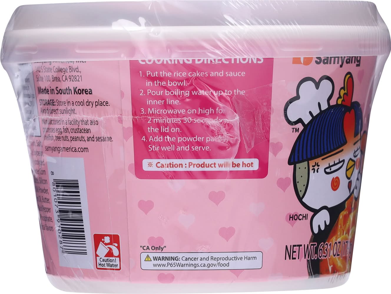 Directions: microwave in use: 1000w: 2min 30s; 700w: 3min 30s. cooking directions: 1. put the rice cake and sauce in the cup. 2. pour the hot water up to the inner line. 3. use microwave oven and heat up to 2 mins and 30 secs(1000w) or 3 mins and 30 secs(700w) with the lid on. 4. put powder packet, stir well and serve. caution: product will be hot. caution: hot water. best if used by date mentioned on the bottom of cup.