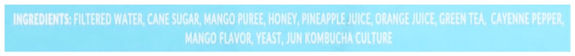Ingredients: Filtered Water, Cane Sugar (Organic Ingredients), Mango Puree (Organic Ingredients), Honey (Organic Ingredients), Pineapple Juice (Organic Ingredients), Orange Juice (Organic Ingredients), Green Tea (Organic Ingredients), Cayenne Pepper (Organic Ingredients), Mango Flavor (Organic Ingredients), Yeast, Jun Kombucha Culture