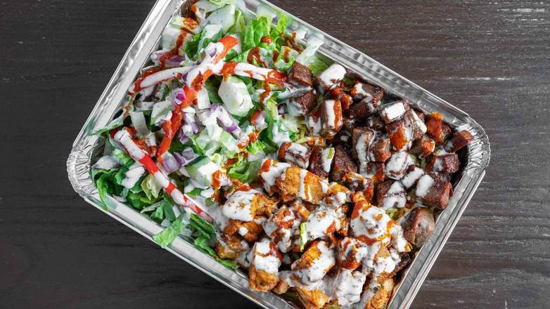 Delicious meal of zabiha halal juicy grilled chicken tikka kebab marinated and lamb gyro over our salad or signature rice or pita with veggies and sauces of your choice.