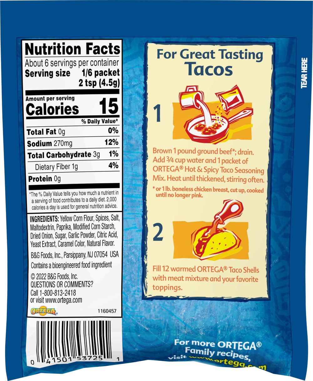 For great tasting tacos: 1. brown 1 pound ground beef (or 1 lb. boneless chicken breast, cut up, cooked until no longer pink); drain. add 3/4 cup water and 1 packet of ortega hot & spicy taco seasoning mix. heat until thickened, stirring often. 2. fill 12 warmed ortega taco shells with meat mixture and your favorite toppings.