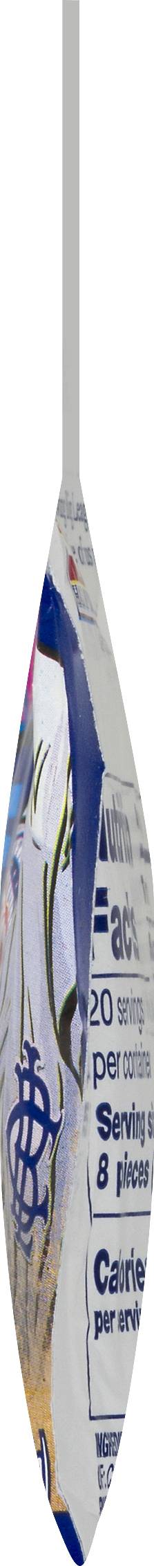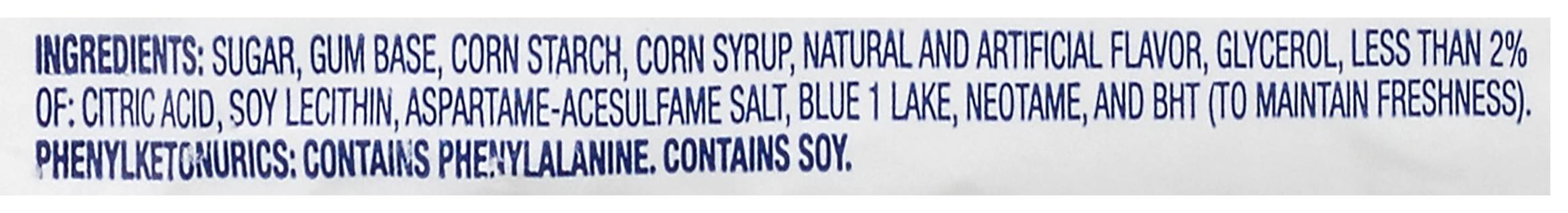 Ingredients: Sugar, Gum Base, Corn Starch, Corn Syrup, Natural and Artificial Flavor, Glycerol, Less than 2% of: Citric Acid, Soy Lecithin, Aspartame-Acesulfame Salt, Blue 1 Lake, Neotame, and BHT (to Maintain Freshness) Contains: Soybeans