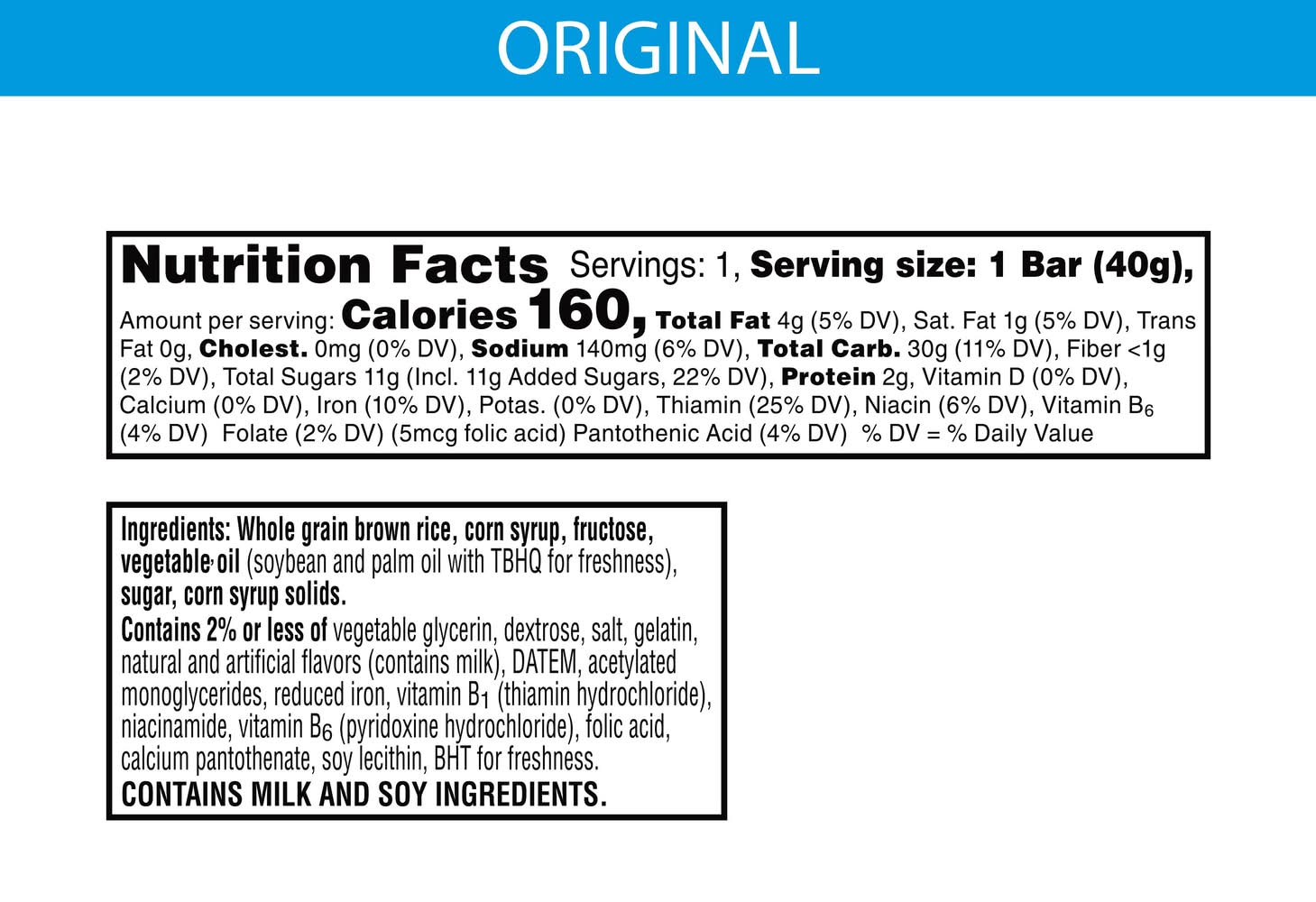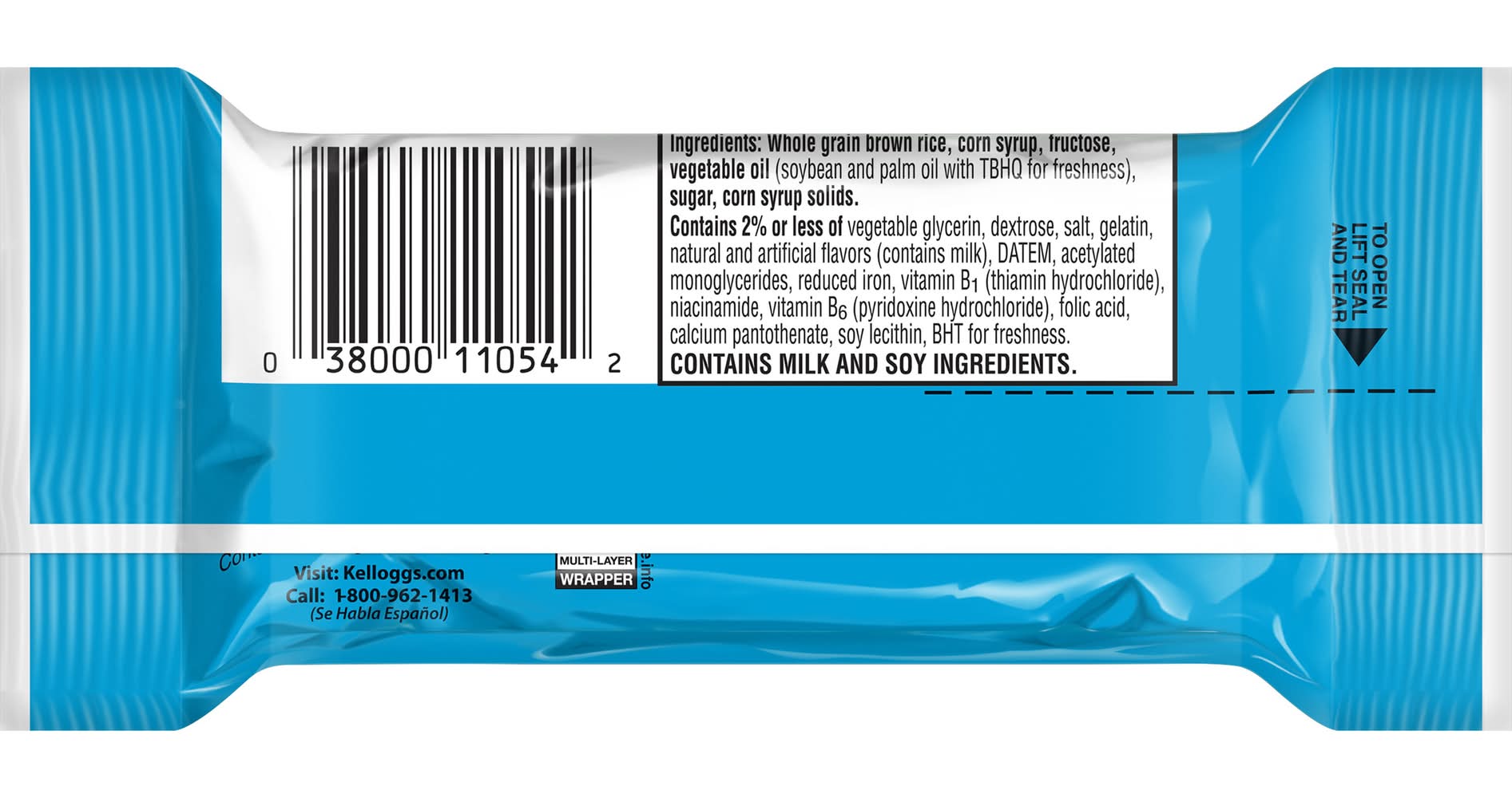 Ingredients: Whole Grain Brown Rice, Corn Syrup, Fructose, Vegetable Oil (Soybean And Palm Oil With Tbhq For Freshness), Sugar, Corn Syrup Solids. Contains 2% Or Less Of Vegetable Glycerin, Dextrose, Salt, Gelatin, Natural And Artificial Flavors (Contains Milk), Datem, Acetylated Monoglycerides, Reduced Iron, Vitamin B1 (Thiamin Hydrochloride), Niacinamide, Vitamin B6 (Pyridoxine Hydrochloride), Folic Acid, Calcium Pantothenate, Soy Lecithin, Bht For Freshness. Contains: Contains milk and soy ingredients.