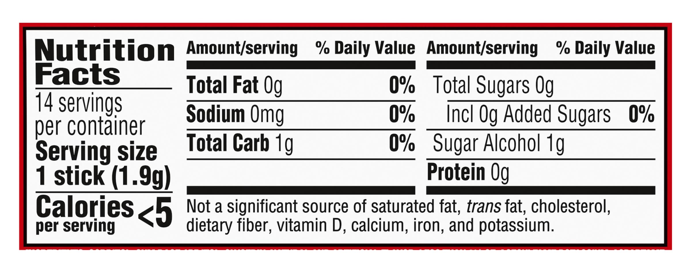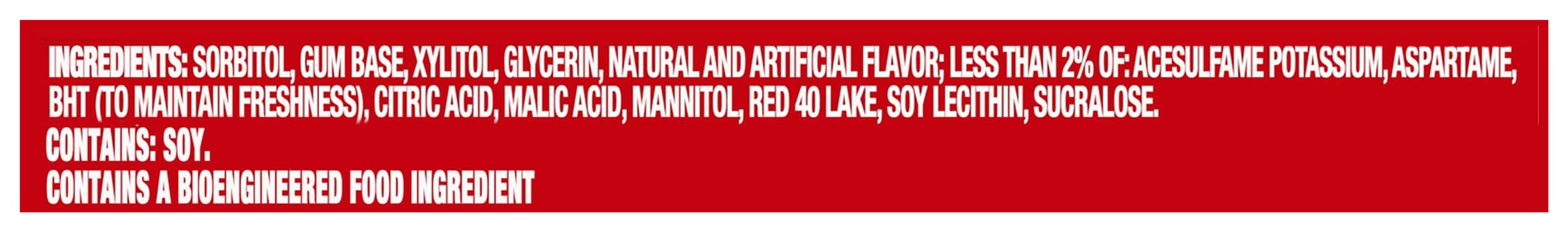 Ingredients: INGREDIENTS: SORBITOL, GUM BASE, XYLITOL, GLYCERIN, NATURAL AND ARTIFICIAL FLAVOR; LESS THAN 2% OF: ACESULFAME POTASSIUM, ASPARTAME, BHT (TO MAINTAIN FRESHNESS), CITRIC ACID, MALIC ACID, MANNITOL, RED 40 LAKE, SOY LECITHIN, SUCRALOSE.PHENYLKETONURICS: CONTAINS PHENYLALANINE. CONTAINS: SOY. Contains: Soybeans