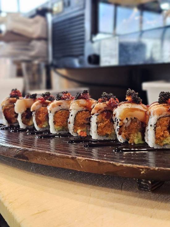 Seared japanese garlic bonito, spicy salmon, avocado inside, topped with seared salmon, hokkaido scallop, spicy crunchy garlic, caviar, eel sauce