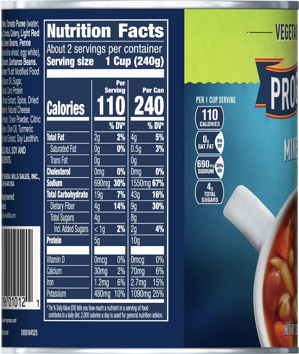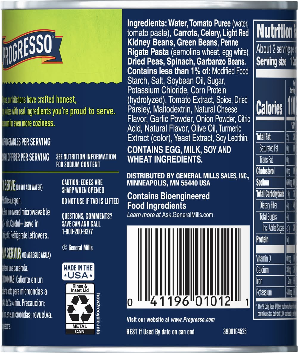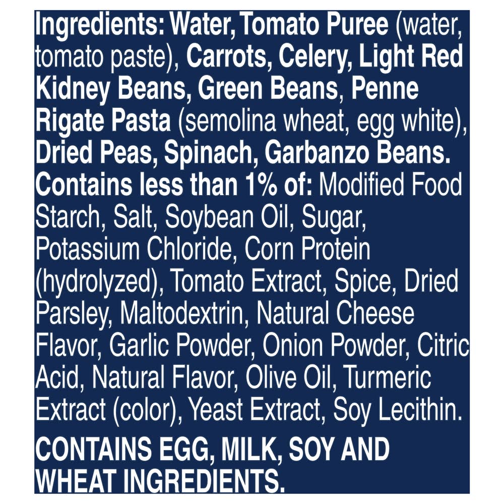 Ingredients: Water, Tomato Puree (Water, Tomato Paste), Carrots, Celery, Light Red Kidney Beans, Green Beans, Penne Rigate Pasta (Semolina Wheat, Egg White), Dried Peas, Spinach, Garbanzo Beans. Contains Less than 1% of: Modified Food Starch, Salt, Soybean Oil, Sugar, Potassium Chloride, Corn Protein (Hydrolyzed), Tomato Extract, Spice, Dried Parsley, Maltodextrin, Natural Cheese Flavor, Garlic Powder, Onion Powder, Citric Acid, Natural Flavor, Olive Oil, Turmeric Extract (Color), Yeast Extract, Soy Lecithin Contains: Eggs, Milk, Soybeans, Wheat, Celery