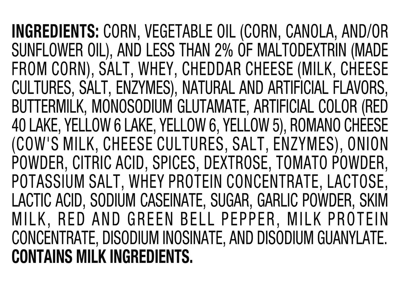 Ingredients: Corn, Vegetable Oil (Sunflower, Canola, and/or Corn Oil), Maltodextrin (Made from Corn), Salt, Whey, Cheddar Cheese (Milk, Cheese Cultures, Salt, Enzymes), Natural and Artificial Flavors, Buttermilk, Monosodium Glutamate, Artificial Color (Red 40 Lake, Yellow 6 Lake, Yellow 6, Yellow 5), Romano Cheese (Cow's Milk, Cheese Cultures, Salt, Enzymes), Onion Powder, Citric Acid, Spices, Dextrose, Tomato Powder, Potassium Salt, Whey Protein Concentrate, Lactose, Lactic Acid, Sodium Caseinate, Sugar, Garlic Powder, Skim Milk, Red and Green Bell Pepper Powder, Milk Protein Concentrate, Disodium Inosinate, and Disodium Guanylate Contains: Milk, Corn, Lactose