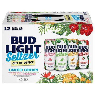 Bud Light Out Of Office Assorted Hard Seltzer is a limited edition variety pack inspired by classic cocktail flavors. Ideal for relaxing settings like the pool, beach, or backyard, this product offers a vibrant twist on bold cocktail tastes. Included in the assortment are Tropical Punch, Lime Margarita, Watermelon Mojito, Strawberry Daiquiri, Red Sangria Style, White Sangria Style, Rosé Sangria Style, and Tropical Sangria Style. The product is characterized as 100% Hard Seltzer, free of beer and wine. Each can contains 12 fluid ounces of seltzer. • Brand: Bud light • Pack size: 12 • Alcohol by volume: 5%