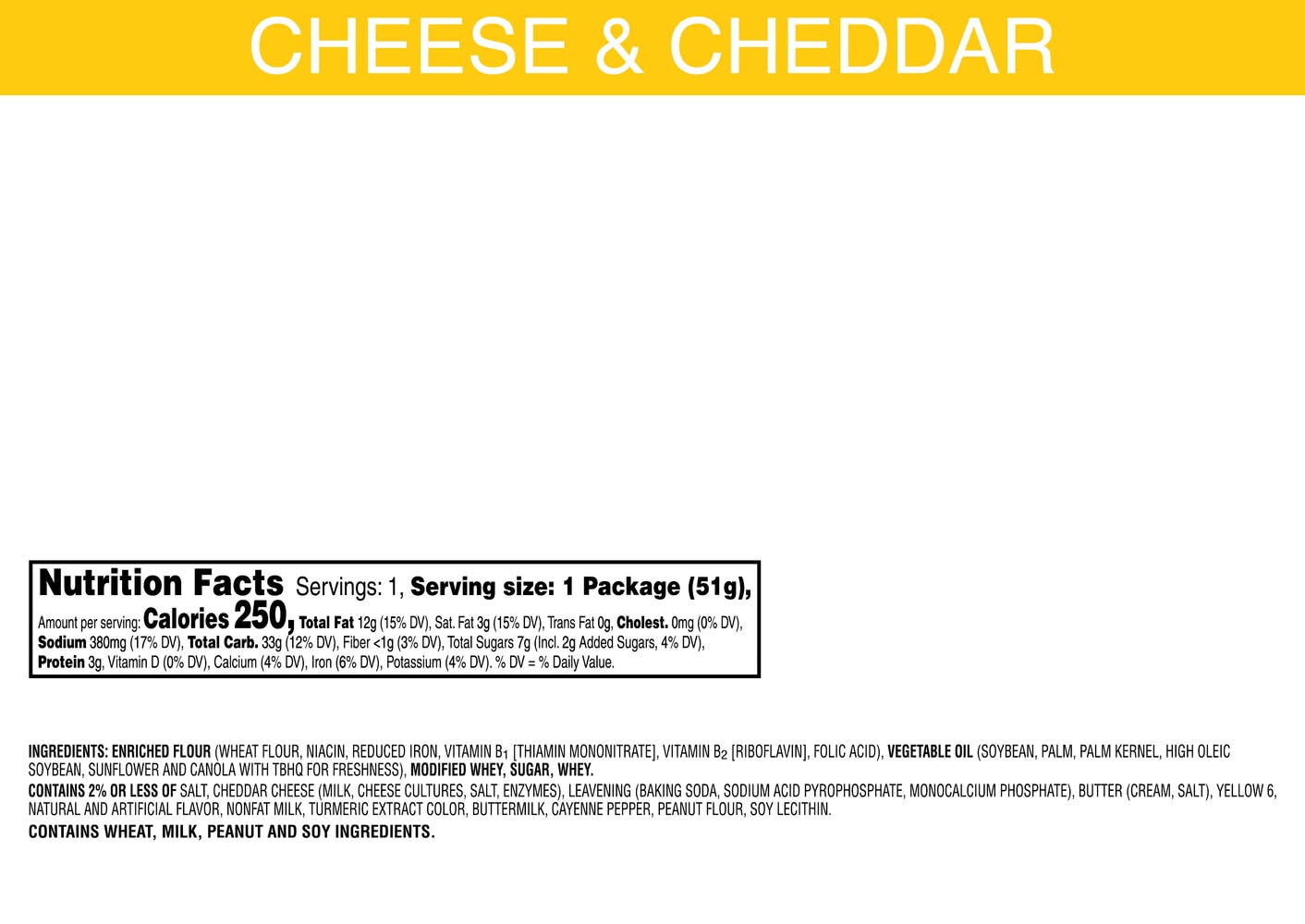 Ingredients: Enriched Flour (Wheat Flour, Niacin, Reduced Iron, Vitamin B1 [Thiamin Mononitrate], Vitamin B2 [Riboflavin], Folic Acid), Vegetable Oil (Soybean, Palm, Palm Kernel, High Oleic Soybean, Sunflower And Canola With Tbhq For Freshness), Modified Whey, Sugar, Whey. Contains 2% Or Less Of Salt, Cheddar Cheese (Milk, Cheese Cultures, Salt, Enzymes), Leavening (Baking Soda, Sodium Acid Pyrophosphate, Monocalcium Phosphate), Butter (Cream, Salt), Yellow 6, Natural And Artificial Flavor, Nonfat Milk, Turmeric Extract Color, Buttermilk, Cayenne Pepper, Peanut Flour, Soy Lecithin. Contains: Contains wheat, milk, peanut and soy ingredients.
