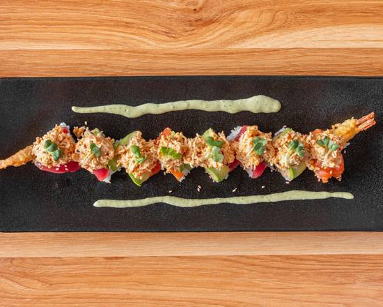 Consuming raw. Shrimp tempura, spicy imitation crab salad, top with tuna, salmon, avocado, and spicy imitation crab salad. Served with sumo sauce.