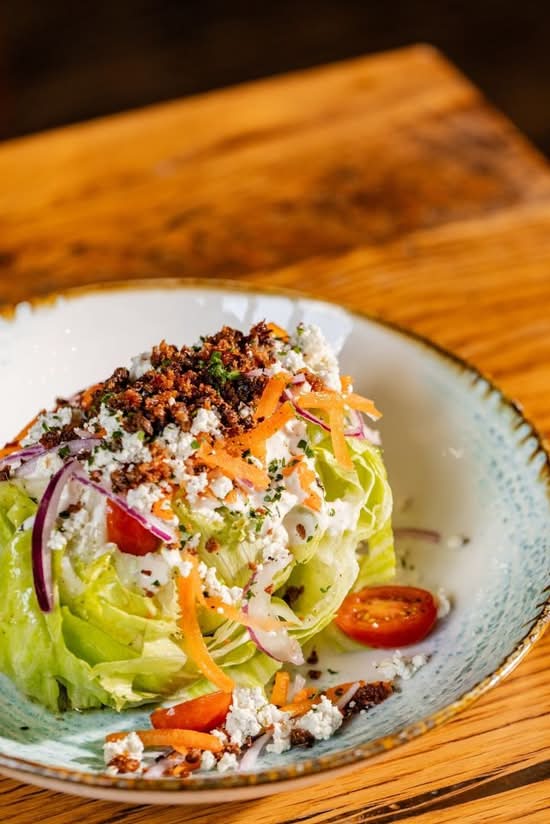 bleu cheese dressing & crumble, carrots, tomatoes, red onion, warm bacon, Texas honey & herb vinaigrette