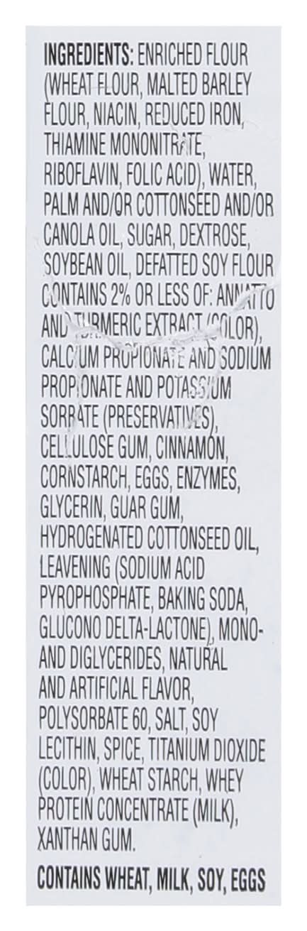 Ingredients: Enriched Flour (Wheat Flour, Malted Barley Flour, Niacin, Reduced Iron, Thiamine Mononitrate, Riboflavin, Folic Acid), Water, Palm and/or Cottonseed and/or Canola Oil, Sugar, Dextrose, Soybean Oil, Defatted Soy Flour, Contains 2% or Less of: Annatto and Turmeric Extract (Color), Calcium Propionate and Sodium Propionate and Potassium Sorbate (Preservatives), Cellulose Gum, Cinnamon, Cornstarch, Eggs, Enzymes, Glycerin, Guar Gum, Hydrogenated Cottonseed Oil, Leavening (Sodium Acid Pyrophosphate, Baking Soda, Glucono Delta-Lactone), Mono- and Diglycerides, Natural and Artificial Flavor, Polysorbate 60, Salt, Soy Lecithin, Spice, Titanium Dioxide (Color), Wheat Starch, Whey Protein Concentrate (Milk), Xanthan Gum Contains: Wheat, Milk, Soybeans, Eggs, Barley, Corn