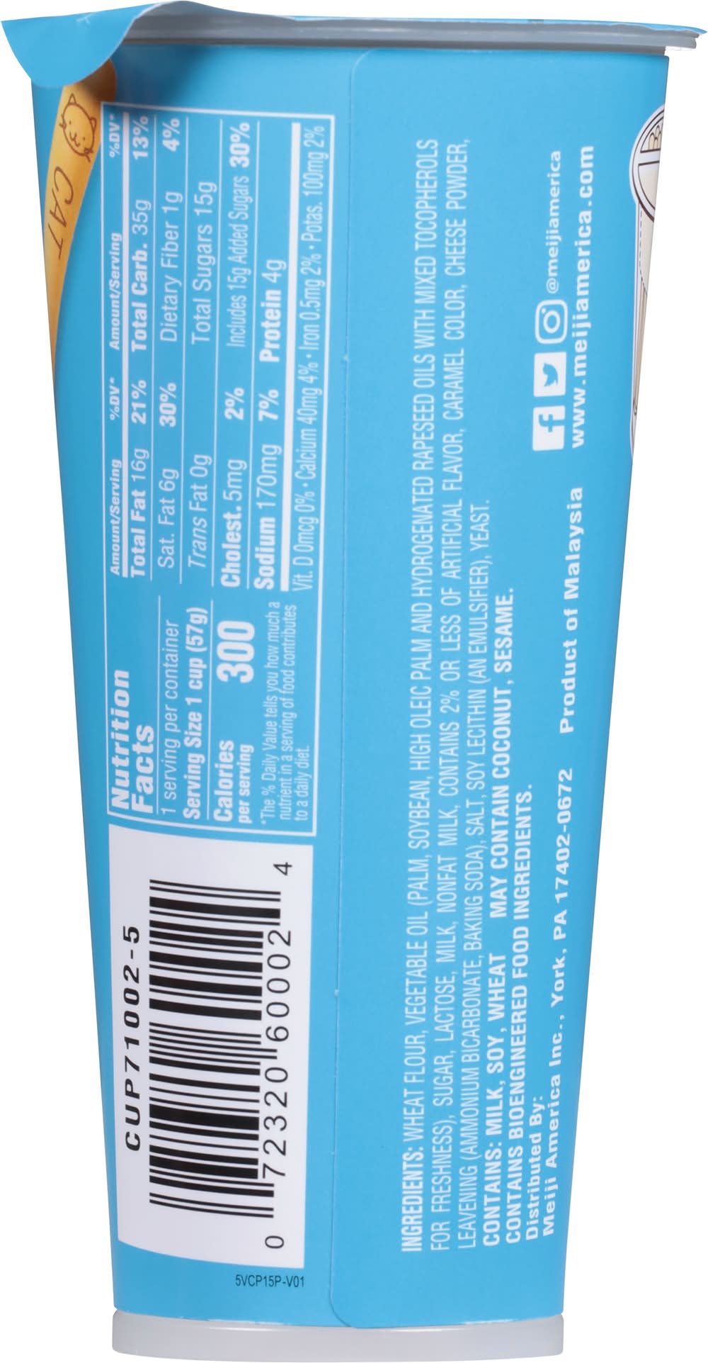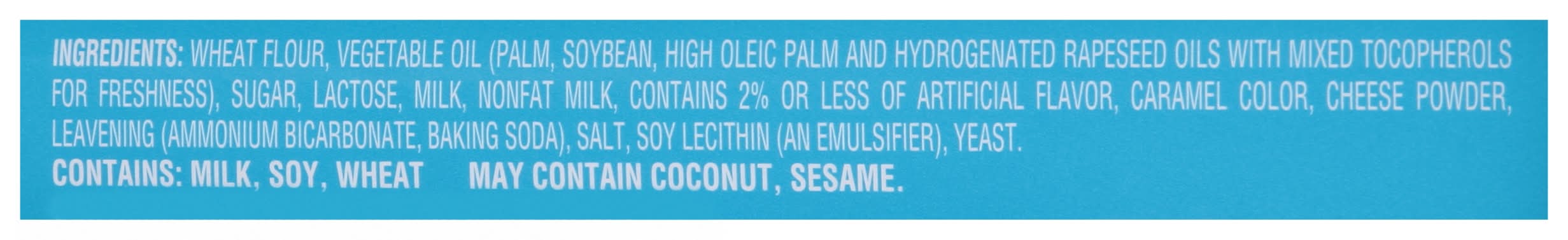 Ingredients: Wheat Flour, Vegetable Oil (Palm, Soybean, High Oleic Palm and Hydrogenated Rapeseed Oils with Mixed Tocopherols for Freshness), Sugar, Lactose, Milk, Nonfat Milk, Contains 2% or Less of Artificial Flavor, Caramel Color, Cheese Powder, Leavening (Ammonium Bicarbonate, Baking Soda), Salt, Soy Lecithin (an Emulsifier), Yeast Contains: Milk, Soybeans, Wheat, Lactose, Tree Nuts, Coconuts, Sesame