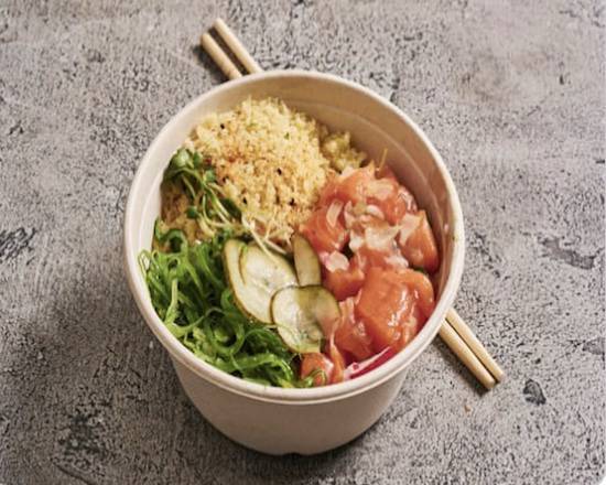 Hawaiian salted salmon, onion and jalapeño, over rice, with house pickles, radish, sprouts and scallions.