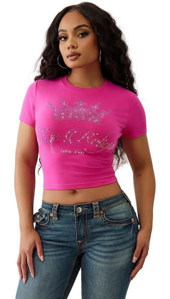 Give yourself the royal treatment with the True Religion Women's Crystal Crown Logo Baby Tee. This fitted, cropped style features a crystal crown-topped logo so you can sparkle like a true queen. Cropped fit 95% Cotton, 5% elastane Machine wash Imported • Color: Pink • Size: M • female