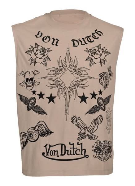 The Von Dutch Men's Embellish Tattoo Ancient Scroll Muscle Shirt features the brand's iconic logo and an edgy street-style design. Crafted from soft, breathable cotton, it ensures all-day comfort with a relaxed fit that moves with you. Retro vibes meet a modern twist in this muscle shirt, adding bold character to your line-up. Lightweight construction and versatile style deliver effortless appeal in any setting. Material: 100% Cotton provides a breathable, soft feel against skin and holds shape. Care: Machine Washable maintains fit, color, and ease of care after repeated cleaning cycles. Design: Bold Graphic features a vibrant tattoo-inspired ancient scroll artwork that stands out. • Color: Tan • Size: XXL • male
