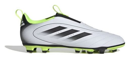 Pull on the adidas Goletto IX FG/MG "Ftwr White/Core Black/Lucid Lemon" Preschool Kids' Soccer Cleat and shine on the pitch. The soft synthetic upper offers padding and perforations at strategic spots, ensuring lasting comfort. A laceless forefoot creates a clean strike zone. A versatile outsole maintains quick movement on firm ground and artificial grass. At least 20% recycled materials reduce waste, shrinking the product's footprint and supporting sustainability. Regular Fit: Aligns with standard sizing in kids soccer cleats. Laceless Construction: Stretchy band secures feet and clears lace zone typical in laceless soccer shoes. Synthetic Upper: Delivers lightweight durability and easy cleanup. Padded Collar: Cushions ankles during rapid changes in direction. Firm/Multi-ground Outsole: Offers traction on both firm ground and artificial grass. • Color: White/black/volt • Size: 12 • unisex
