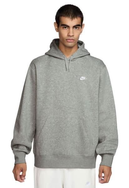 The Nike Men’s Club Pull-Over Fleece Hoodie in Grey blends clean style with everyday comfort. Designed with a smooth exterior and a soft brushed fleece interior, it offers a versatile layer that feels as good as it looks. Perfect for casual outings or lounging, this hoodie balances warmth and breathability in a classic silhouette. Featuring an adjustable hood, ribbed cuffs, and a snug hem, it helps lock in warmth while maintaining shape after repeated washes. Durable fabric construction ensures it withstands daily wear, while the super-soft interior enhances comfort, making it a go-to layer for all-day ease and dependable style. Embroidered Nike Futura Logo: Offers a sleek look with raised stitching. Pouch Pocket: Provides easy storage and added warmth on cold days. Ribbed Hem And Cuffs: Ensures a secure fit and retains shape. Body: Crafted from 80% cotton and 20% polyester. Hood Lining: Made with 80% cotton and 20% polyester. Machine Wash: Allows fast and convenient cleaning. Imported • Color: Grey • Size: M • male