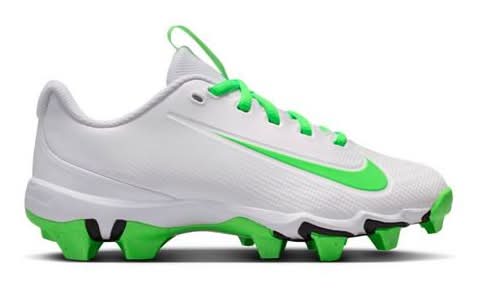Stay one step ahead of the competition in the Nike Kyler Vapor Shark "White/Green Strike/Pink Foam/Black" Grade School Boys' Football Cleat. The lightweight multi-color upper contours to the foot for a snug, supportive fit that moves naturally through each play. A Fastflex outsole promotes quick acceleration, agile cuts, and smooth transitions on the field. Designed with a low-profile build, these cleats keep young athletes light on their feet, ready to unleash game-changing moves inspired by Kyler Murray. Nike Fastflex Technology: Move freely when cutting and running on the field.Synthetic Upper: Durable and easy to clean after use.Rubber Cleats: Deliver reliable grip and traction on grass.Phylon Midsole: Offer soft, lightweight cushioning with stable support.Side Perforations: Include perforations on the sides to increase ventilation.Classic Laces: Secure the fit with a traditional lace-up closure.Imported • Color: White/green • Size: 5 • male