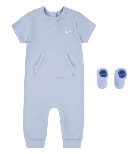 The Nike Infant Kids' Ribbed Short Sleeved Romper and Sock Set-Blue uses soft cotton jersey knit that feels gentle against baby's skin. Snappy tape closures at the shoulder and inseam let you change and dress quickly.This all-in-1 romper and sock set includes matching socks that complete the look. The ribbed texture adds a subtle touch of style to every movement. It balances comfort and convenience, keeping tiny athletes happy all day. Material: 100% cotton jersey knit offers gentle feel against baby's skin. Care: Machine wash. Design: Ribbed short sleeves deliver a snug, stretchy fit. Closure: Snappy tape closures at shoulder and inseam allow quick changes. Socks: Matching socks complete the look. Imported • Color: Blue • Size: 6-12M • unisex