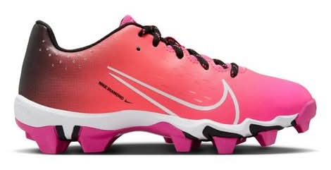 Sprint between bases, slide into every play and score in style with the Nike Hyperdiamond 4 Keystone GG "Fuchsia/White/Hot Punch/Black" Preschool Girls' Softball Cleat. A durable rubber outsole with molded studs grips turf and dirt, helping beat the relay throw from the outfield just in time.Stay nimble on defense with traction that locks in every step. This cleat keeps young players ready to respond swiftly at each base. Leather Upper: Leather upper with durable molded details adds lasting durability.Padded Collar And Tongue: Creates a secure, comfortable fit around the ankle.Thick Heel Counter: Helps prevent wear and tear during play.Rubber Outsole: Uses Nike Grind material with recycled content.Foam Midsole: Provides responsive, lightweight cushioning.Rubber Studs: Enhance traction and stability on soft ground. • Color: Pink/black • Size: 11 • female