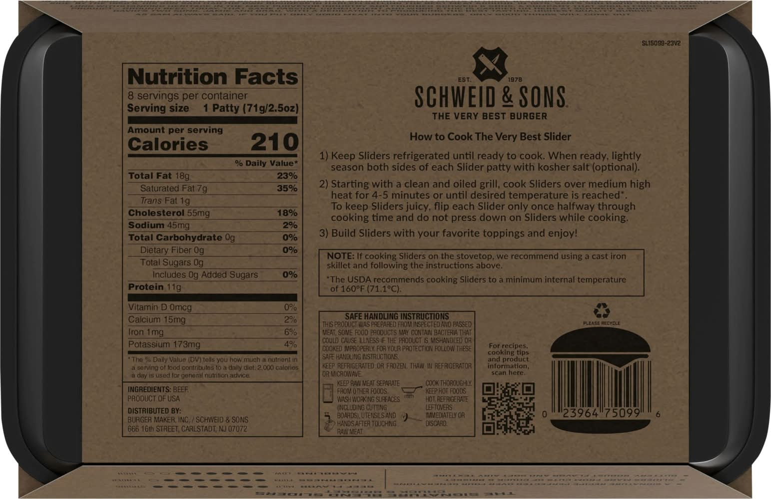 Directions for use: Safe Handling Instructions: This product was prepared from inspected and passed meat and/or poultry. Some food products may contain bacteria that could cause illness if the product is mishandled or cooked improperly. For your protection, follow these safe handling instructions. Keep refrigerated or frozen. Thaw in refrigerator or microwave. Keep raw meat and poultry separate from other foods. Wash working surfaces (including cutting boards), utensils, and hands after touching raw meat or poultry. Cook thoroughly. Keep hot foods hot. Refrigerate leftovers immediately or discard. How to Cook the Very Best Slider: 1. Keep Sliders refrigerated until ready to cook. When ready, lightly season both sides of each Slider patty with kosher salt (optional). 2. Starting with a clean and oiled grill, cook Sliders over medium high heat for 4-5 minutes or until desired temperature is reached (The USDA recommends cooking sliders to a minimum internal temperature of 160 degrees F (71.1 degrees C). To keep Sliders juicy, flip each Slider only once halfway through cooking time and do not press down on Sliders while cooking. 3. Build Sliders with your favorite toppings and enjoy! Note: If cooking sliders on the stovetop, we recommend using a cast iron skillet and following the instructions above. Keep refrigerated. Storage recommendation: Keep refrigerated.