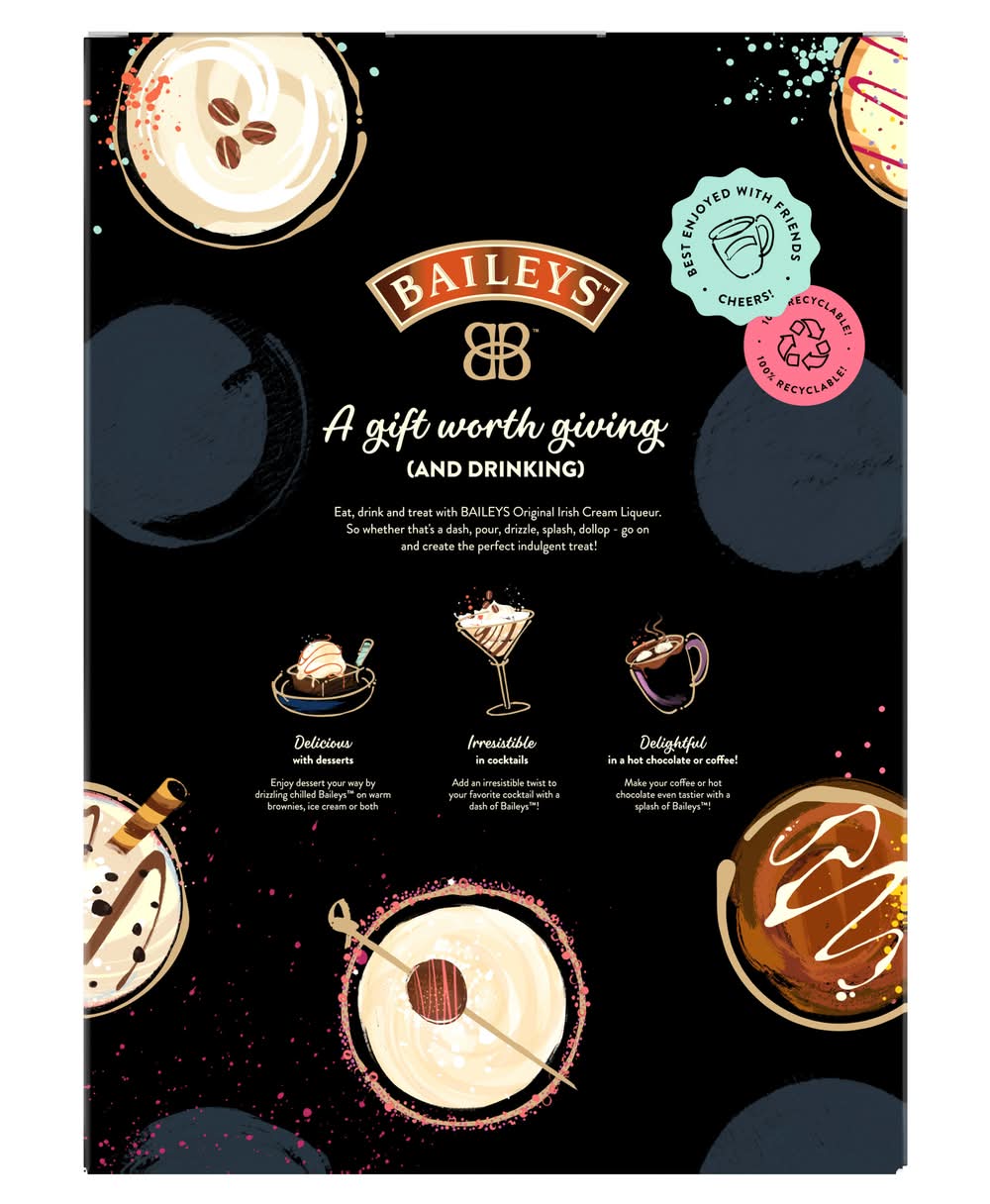 Always a decadent choice for sipping, our 34 proof Baileys Original Irish Cream Liqueur is the perfect marriage of premium Irish dairy cream and a unique chocolate and vanilla blend for a decadent taste ready for serving in the branded glass mug included in this set. Best enjoyed in a spiked coffee cocktail. Includes one 34 proof 750 mL bottle of Original Irish Cream Liqueur and a branded glass mug. Please drink responsibly. Alcohol by volume: 17%