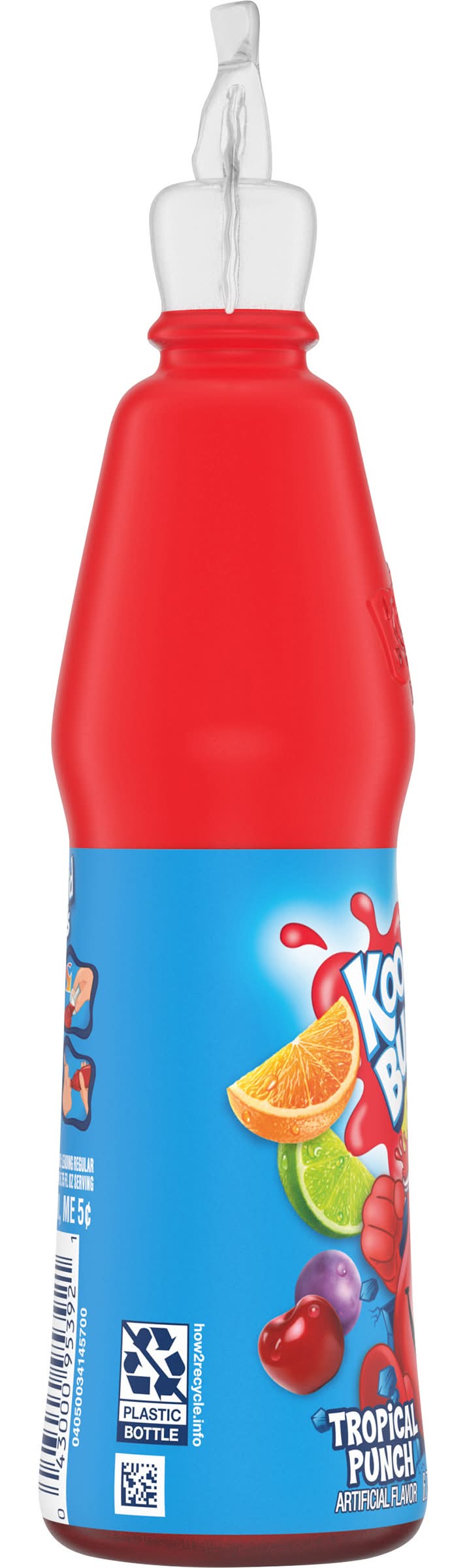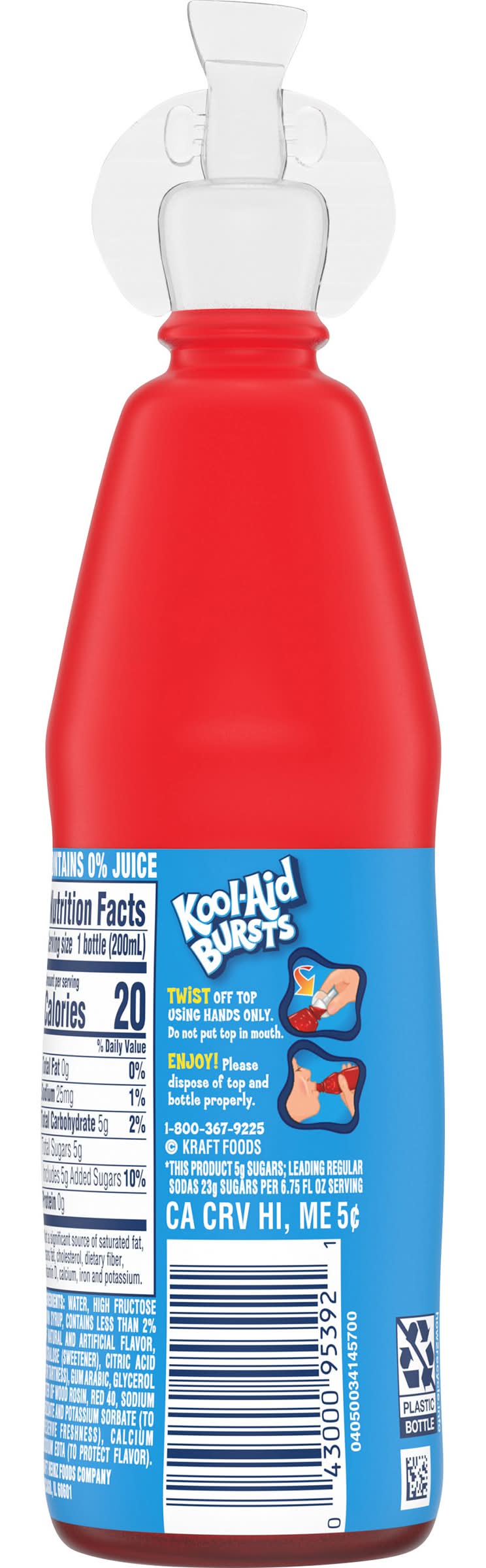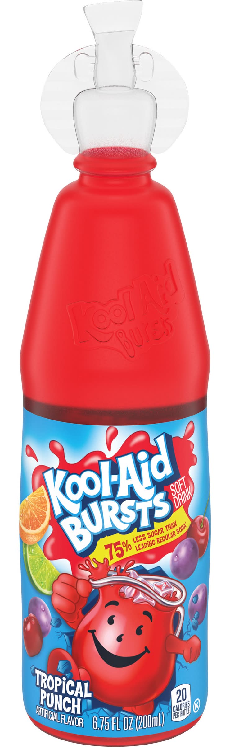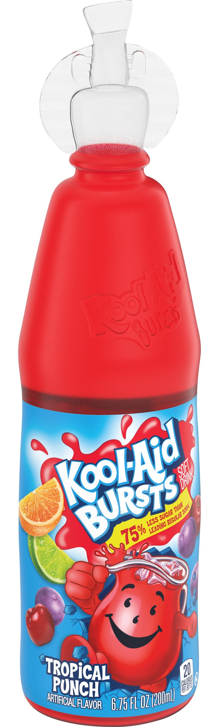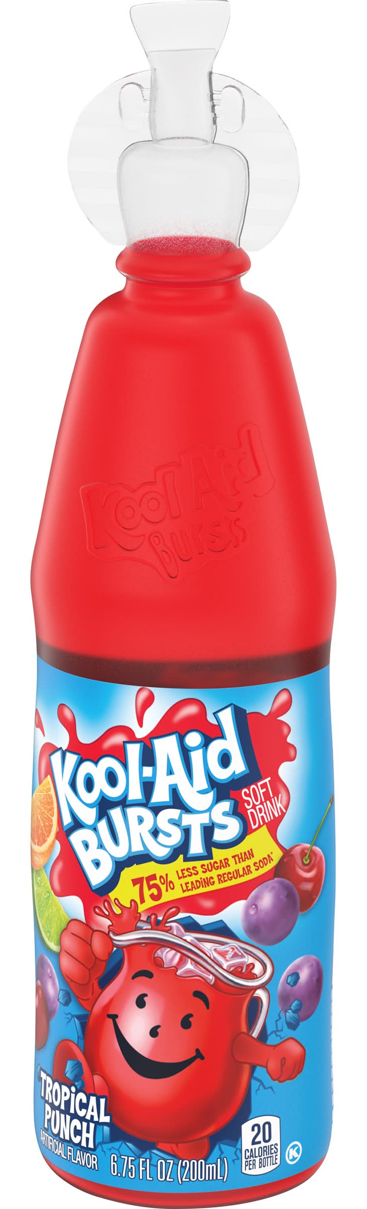 Kool Aid Bursts Tropical Punch Ready-To-Drink soft drink is a delicious way to stay hydrated. These ready-to-drink bottled soft drinks make it easy to bring a tasty tropical punch flavored drink with you anywhere. Quench your thirst with the refreshingly sweet flavor of tropical punch. With 75% less total sugar than leading regular sodas, this drink is always a great choice for the whole family (this has product 5 grams of sugars; leading regular sodas have 23 grams of sugars per 6.75 fl. oz. serving). The 6.75 fluid ounce individually sealed plastic bottle is perfect for bringing on the go. Enjoy a revitalizing tropical punch drink at work or at home, or pack them in lunches. Store them in the fridge so they're always cold and ready when you're craving a mouthwatering treat on a hot day.