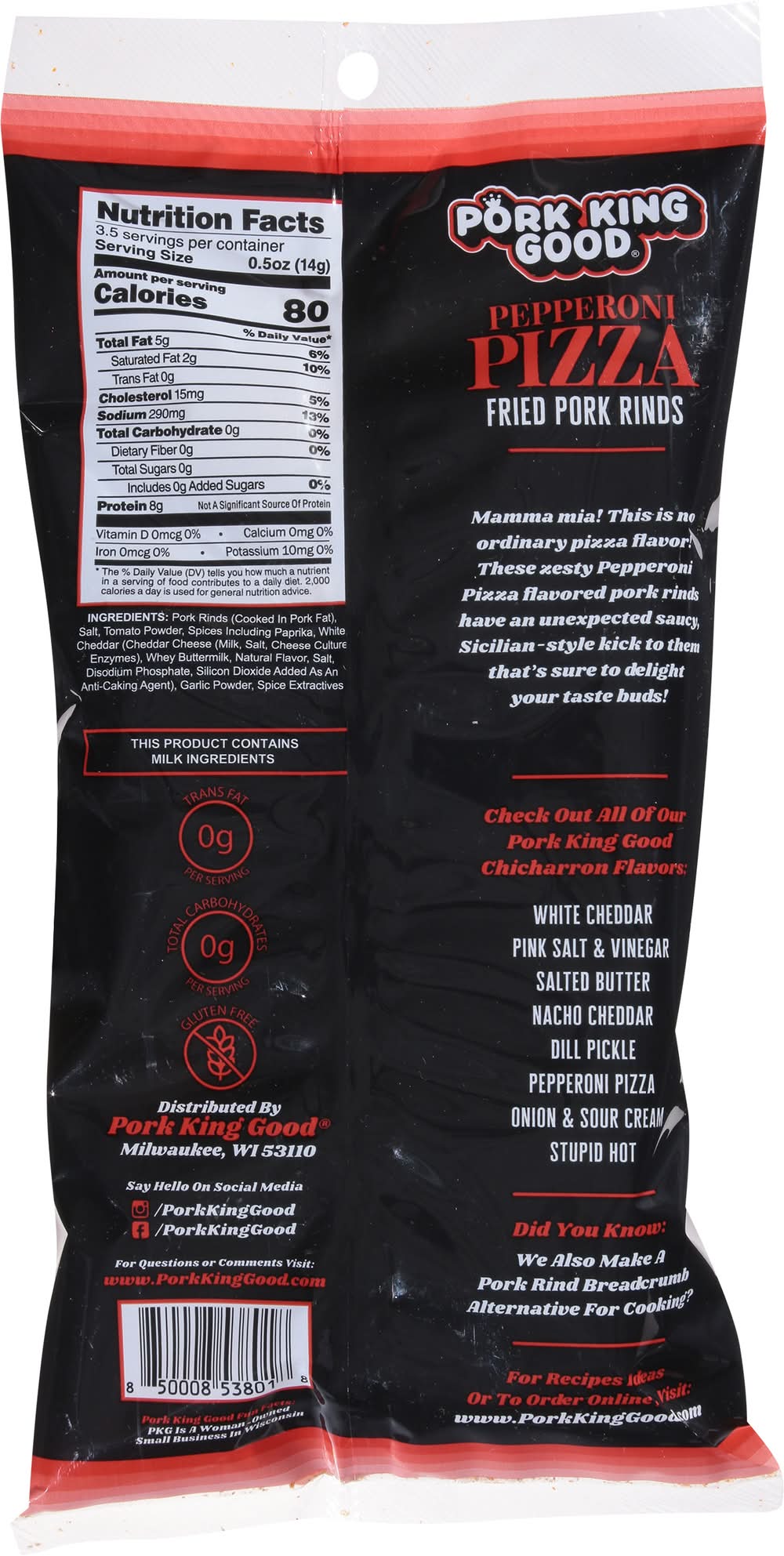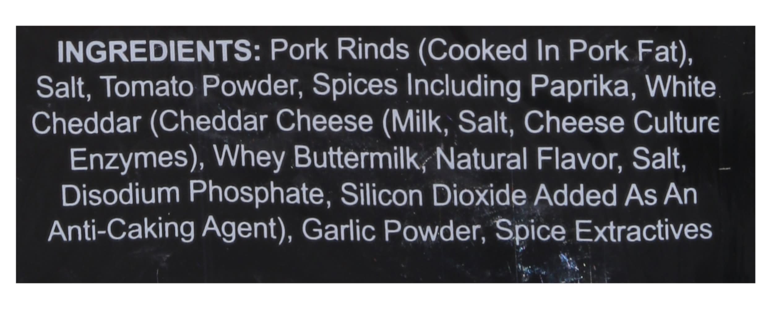 Ingredients: Pork Rinds (Cooked In Pork Fat), Salt, Tomato Powder, Spices Including Paprika, White Cheddar (Cheddar Cheese (Milk, Salt, Cheese Culture Enzymes), Whey Buttermilk, Natural Flavor, Salt, Disodium Phosphate, Silicon Dioxide Added as an Anti-Caking Agent), Garlic Powder, Spice Extractives Contains: Milk