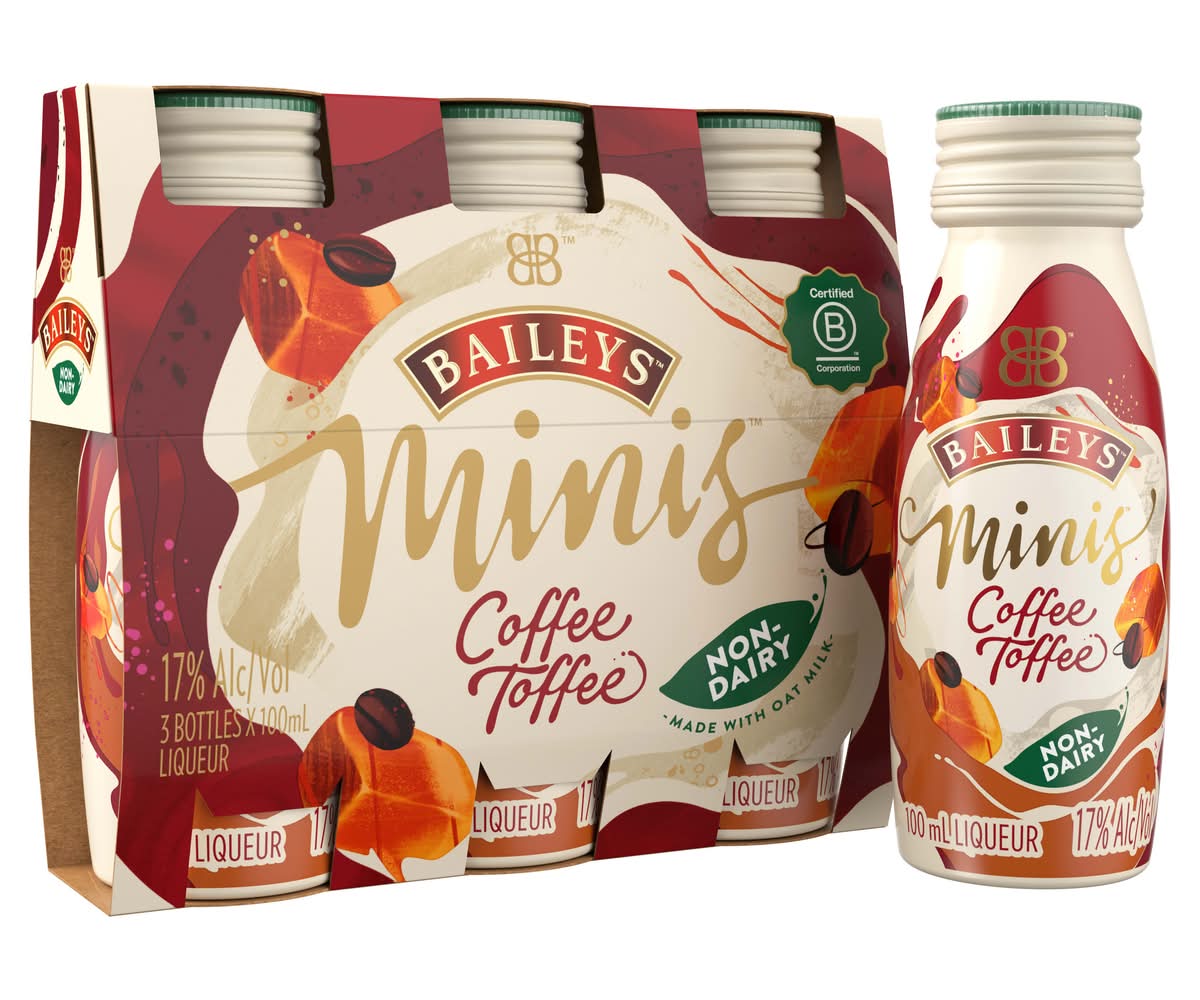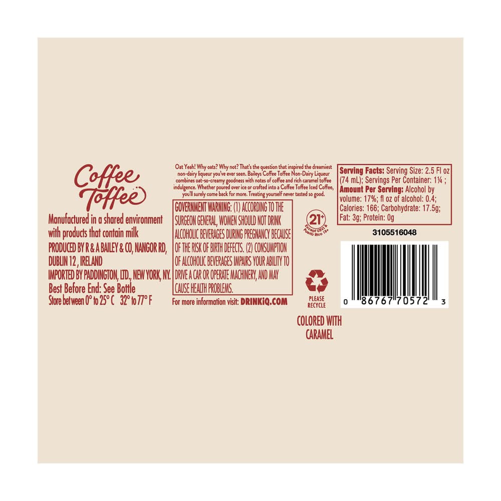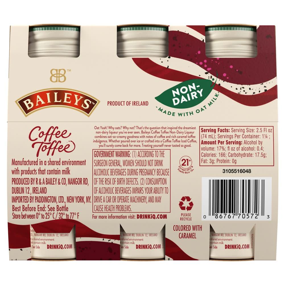 Baileys Non-Dairy Liqueur Made with Oat Milk in decadent Coffee Toffee flavor. Smooth Irish whiskey, fine spirits, and luscious oat milk combined with notes of coffee and rich caramel toffee for an unapologetically delicious Baileys that’s so indulgent it doesn’t need dairy. More than a little treat, it’s the creamy indulgence you know and expect from Baileys, now made with Oat Milk. Try this on-trend flavor in hot or iced coffee, in an elevated brunch cocktail, or on its own for a truly adult treating moment. Baileys Minis are perfect for on-the-go treating occasions and exploring this new delicious flavor with friends. Includes three 34 proof 100 mL bottles of Baileys Minis Coffee Toffee Non-Dairy Liqueur Made with Oat Milk. Please drink responsibly. • Pack size: 3 • Alcohol by volume: 17%