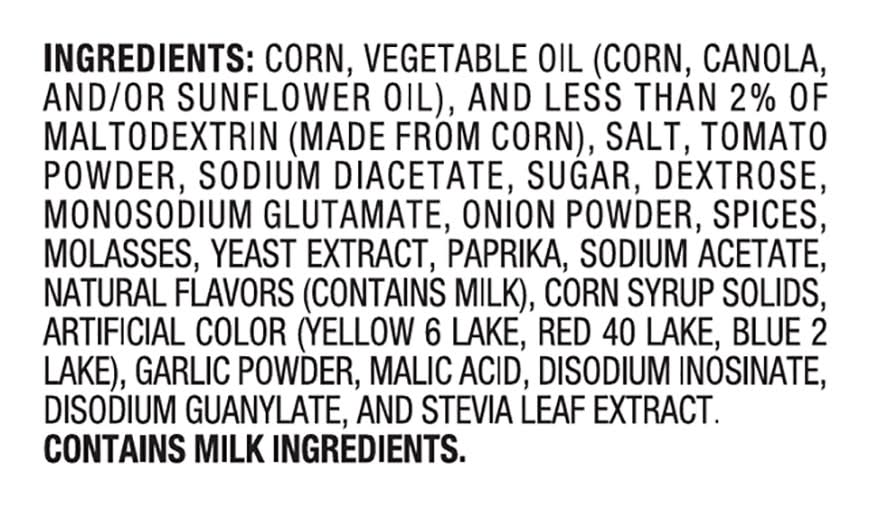 Ingredients: Corn, Vegetable Oil (Corn, Canola, and/or Sunflower Oil), and Less than 2% of Maltodextrin (Made from Corn), Salt, Tomato Powder, Sodium Diacetate, Sugar, Dextrose, Monosodium Glutamate, Onion Powder, Spices, Molasses, Yeast Extract, Paprika, Sodium Acetate, Natural Flavors (Contains Milk), Corn Syrup Solids, Artificial Color (Yellow 6 Lake, Red 40 Lake, Blue 2 Lake), Garlic Powder, Malic Acid, Disodium Inosinate, Disodium Guanylate, and Stevia Leaf Extract Contains: Milk, Corn