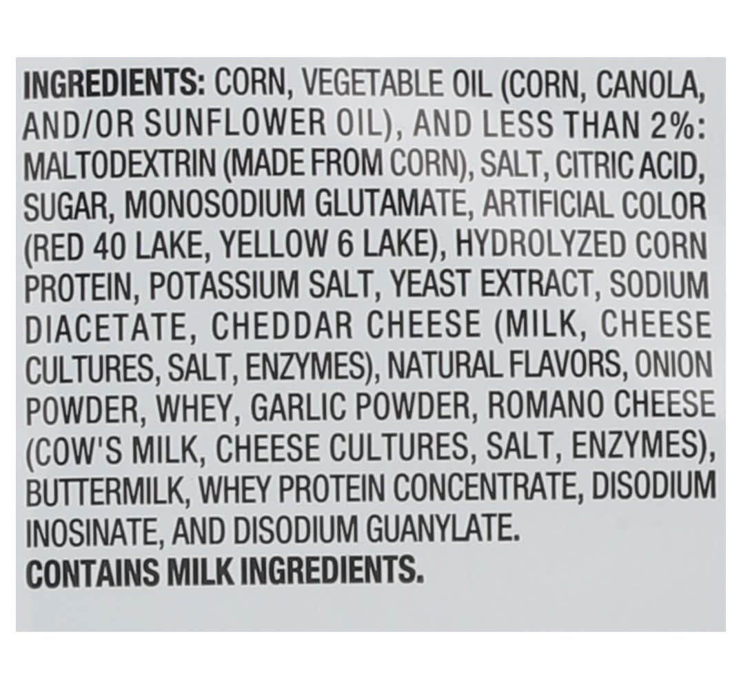 Ingredients: Corn, Vegetable Oil (Corn, Canola, and/or Sunflower Oil), and Less than 2%: Maltodextrin (Made from Corn), Salt, Citric Acid, Sugar, Monosodium Glutamate, Artificial Color (Red 40 Lake, Yellow 6 Lake), Hydrolyzed Corn Protein, Potassium Salt, Yeast Extract, Sodium Diacetate, Cheddar Cheese (Milk, Cheese Cultures, Salt, Enzymes), Natural Flavors, Onion Powder, Whey, Garlic Powder, Romano Cheese (Cow's Milk, Cheese Cultures, Salt, Enzymes), Buttermilk, Whey Protein Concentrate, Disodium Inosinate, and Disodium Guanylate Contains: Corn, Milk