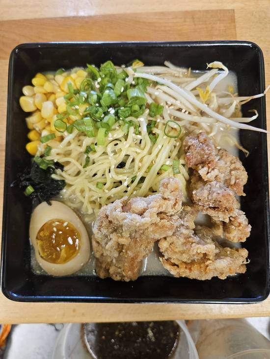 Chicken Karaage Ramen: Crispy fried chicken pieces, choice of tonkotsu, black tonkotsu, miso tonkotsu, shoyu, or miso soup.