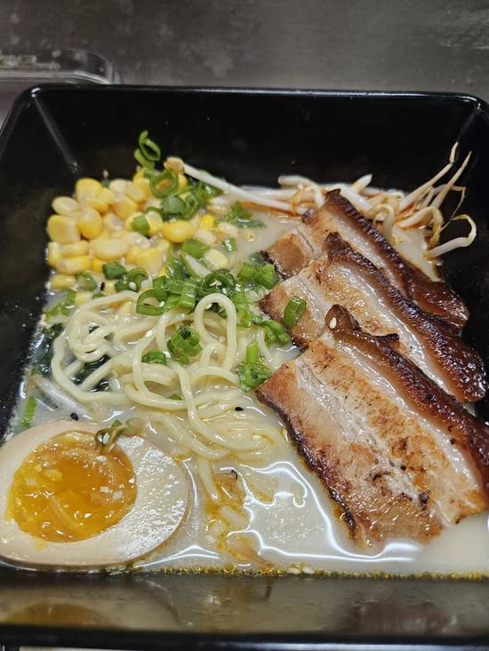 Chasu Ramen with pork belly slices. Options for soup base: tonkotsu, black tonkotsu, miso tonkotsu, and shoyu.