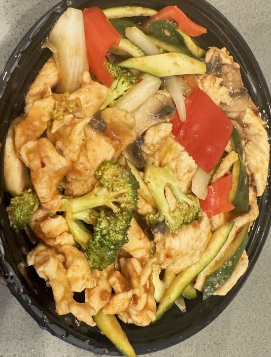 Chicken sautéed with mushrooms, onions, broccoli, zucchini and red pepper in spicy sha cha sauce.