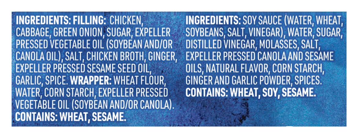 Ingredients: Potstickers: Filling: Chicken, Cabbage, Green Onion, Sugar, Expeller Pressed Vegetable Oil (Soybean and/or Canola Oil), Salt, Chicken Broth, Ginger, Expeller Pressed Sesame Seed Oil, Garlic, Spice, Wrapper: Wheat Flour, Water, Corn Starch, Expeller Pressed Vegetable Oil (Soybean and/or Canola). Sauce: Soy Sauce (Water, Wheat, Soybeans, Salt, Vinegar), Water, Sugar, Distilled Vinegar, Molasses, Salt, Expeller Pressed Canola and Sesame Oils, Natural Flavor, Corn Starch, Ginger and Garlic Powder, Spices. Contains: Wheat, Sesame, Corn, Soybeans, Soybeans