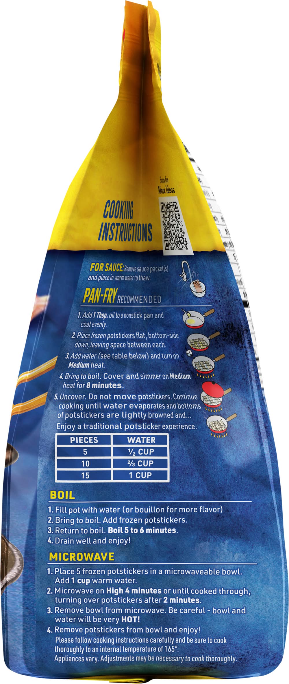 Directions for use: Safe Handling Instructions: This product was prepared from inspected and passed meat and/ or poultry, some food products may contain bacteria that could cause illness if the product is mishandled or cooked improperly. For your protection, follow these safe handling instructions. Keep refrigerated or frozen, thaw in refrigerator or micrówave. Cook Thoroughly. Keep hot foods hot. Refrigerate leftovers immediately or discard. Keep raw meat and poultry separate from other foods, wash working surfaces (including cutting boards), utensils, and hands after touching raw meat or poultry. Boil: Easy One Pan-Prep: Recommended Method: 1. Place sauce packets in hot water to warm. 2. Add 1 tbsp. oil to a nonstick skillet; coat skillet evenly. 3. Place frozen potstickers in a single layer flat-side down, leaving space between potstickers. 4. Add water (see chart below). Bring to boil. Cover and simmer on medium-high 8 minutes. 5. Uncover. Continue cooking until water has evaporated and bottoms of potstickers are lightly browned. Do not move potstickers during cooking. Skillet Size: 8-inch; Water: 1/2 cup. Skillet: 10-inch; Water: 2/3 cup. Skillet Size: 12-inch; Water: 1 cup. Boil: Alternate Cooking Methods: Boil (Traditional Method): 1. Place sauce packets in hot water to warm. 2. Fill saucepan three-quarters full with water. 3. Bring to boil; add frozen potstickers. 4. Return water to boil; boil 5 to 6 minutes. Drain well. To Brown: (Optional): Coat nonstick skillet evenly with oil. Place potstickers in a single layer in the skillet, flat-side down. Cook over medium heat 4 to 5 minutes or until bottoms are golden brown. Do not move potstickers during cooking. Microwave: Microwave (Not Recommended): 1. Place sauce packets in hot water to warm. 2. Place 5 frozen potstickers in a 1-qt. microwaveable bowl; add 1 cup warm water (enough to cover the potstickers). Place bowl on a microwaveable plate. 3. Microwave on high 4 to 5 minutes or until cooked through, stirring after 2 minutes. 4. Drain potstickers. Be careful - bowl and water will be very hot! Please follow cooking instructions carefully and be sure to cook thoroughly to an internal temperature of 165 degrees F. Appliances vary. Adjustments may be necessary to cook thoroughly. Keep frozen. Cut here. Storage recommendation: Keep frozen.